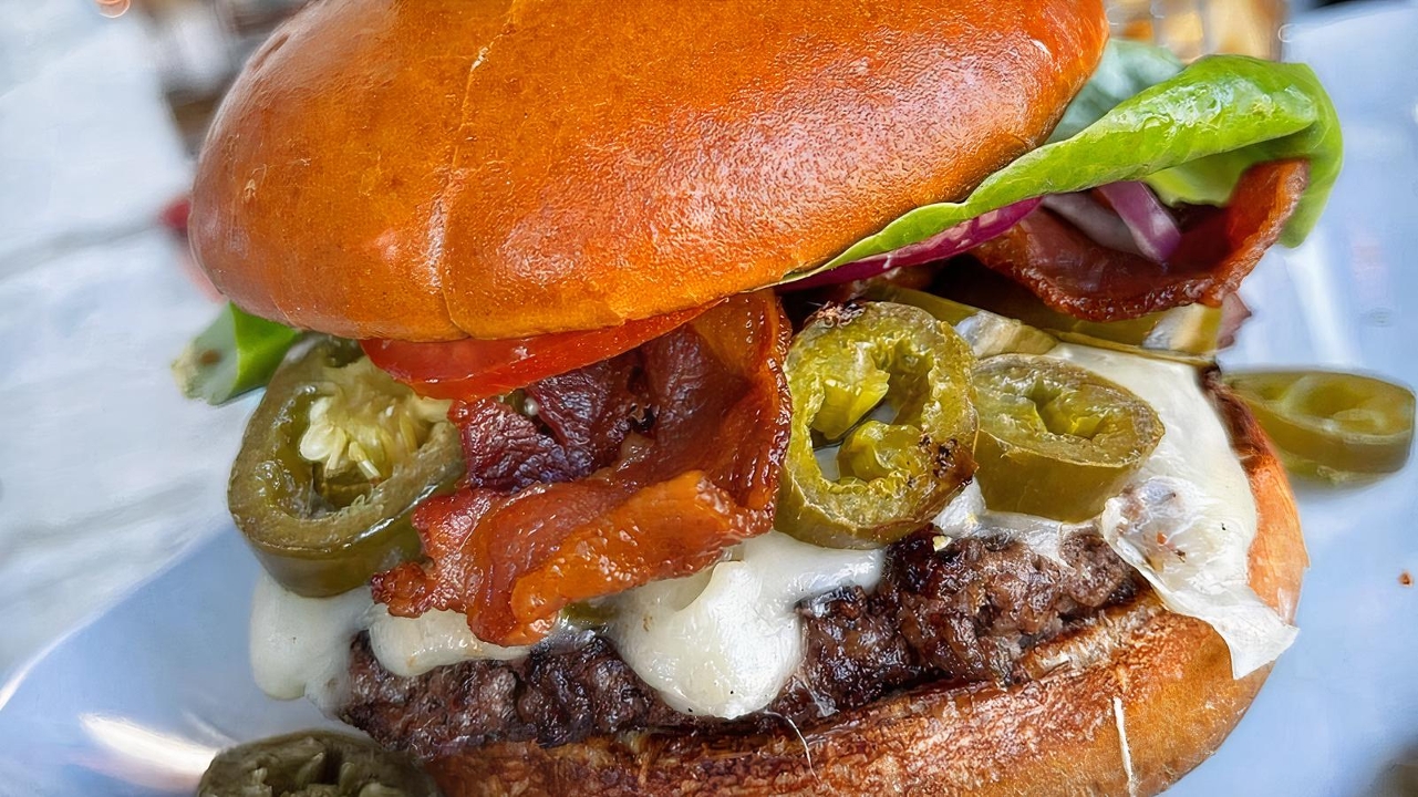 Get ready to heat things up with our Jalapeño Burger! Featuring a succulent beef patty, crispy bacon, melted pepper-jack cheese, pickled jalapeños, fresh lettuce, tomato, onion, and a zesty jalapeño aioli. Topped off with a sizzling chile toreado that'll make your taste buds tingle with delight. Come and take a bite!