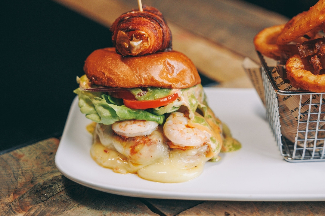 Dive into our Surf N' Turf Burger! This burger is the perfect marriage of land and sea with a juicy beef patty and succulent grilled shrimp. Packed w/ a mouth-watering chiltepin queso blend, salsa verde, and savory chipotle mayo, this burger is a flavor explosion. Topped w/ a delicious Shrimp Torito.
