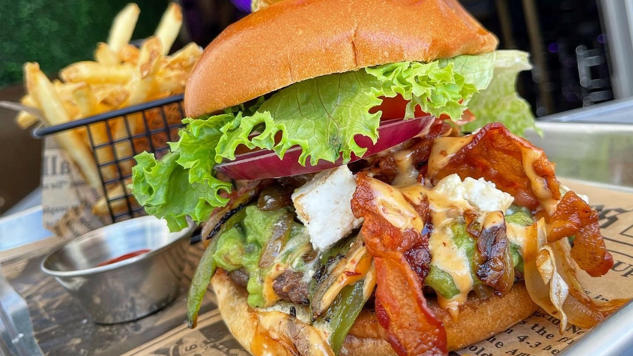 Transport your taste buds to northern Mexico with our 'La Sonorense' burger! Our juicy beef patty is layered with the bold flavors of chile tatemado, grilled onions, creamy guac' & crumbled queso fresco. Then packed w/ lettuce, tomato, onion, and chipotle mayo. Topped with a fiery chile guerito, this burger is a flavor explosion that will leave you craving more.