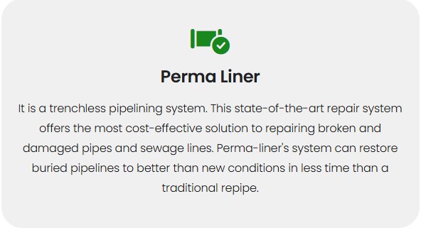 It is a trenchless pipelining system. This state-of-the-art repair system offers the most cost-effective solution to repairing broken and damaged pipes and sewage lines. Perma-liner's system can restore buried pipelines to better than new conditions in less time than a traditional repipe.