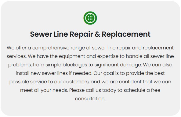 We offer a comprehensive range of sewer line repair and replacement services. We have the equipment and expertise to handle all sewer line problems, from simple blockages to significant damage. We can also install new sewer lines if needed. Our goal is to provide the best possible service to our customers, and we are confident that we can meet all your needs. Please call us today to schedule a free consultation.
