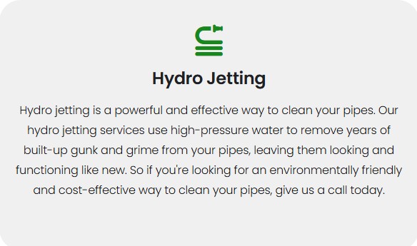 Hydro jetting is a powerful and effective way to clean your pipes. Our hydro jetting services use high-pressure water to remove years of built-up gunk and grime from your pipes, leaving them looking and functioning like new. So if you're looking for an environmentally friendly and cost-effective way to clean your pipes, give us a call today.
