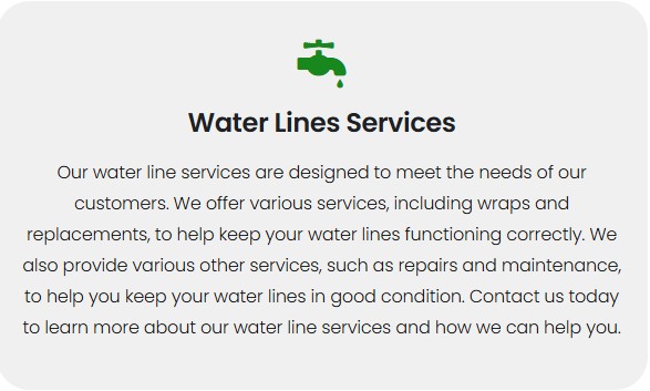 Our water line services are designed to meet the needs of our customers. We offer various services, including wraps and replacements, to help keep your water lines functioning correctly. We also provide various other services, such as repairs and maintenance, to help you keep your water lines in good condition. Contact us today to learn more about our water line services and how we can help you.