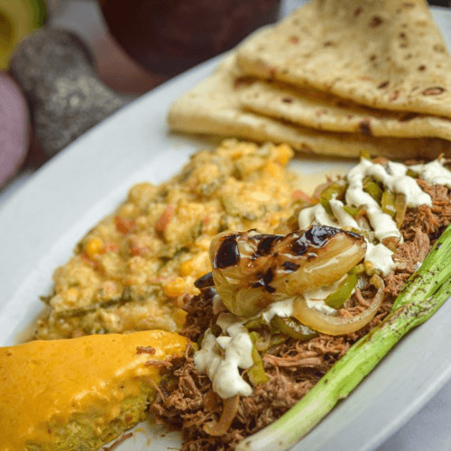 Slow roasted, shredded pork, with caramelized onions, and chiles, garnished with a roasted pepper, green onion, and Anaheim crema, served with tamale pie, calabacitas, and a warm hand-stretched flour tortilla