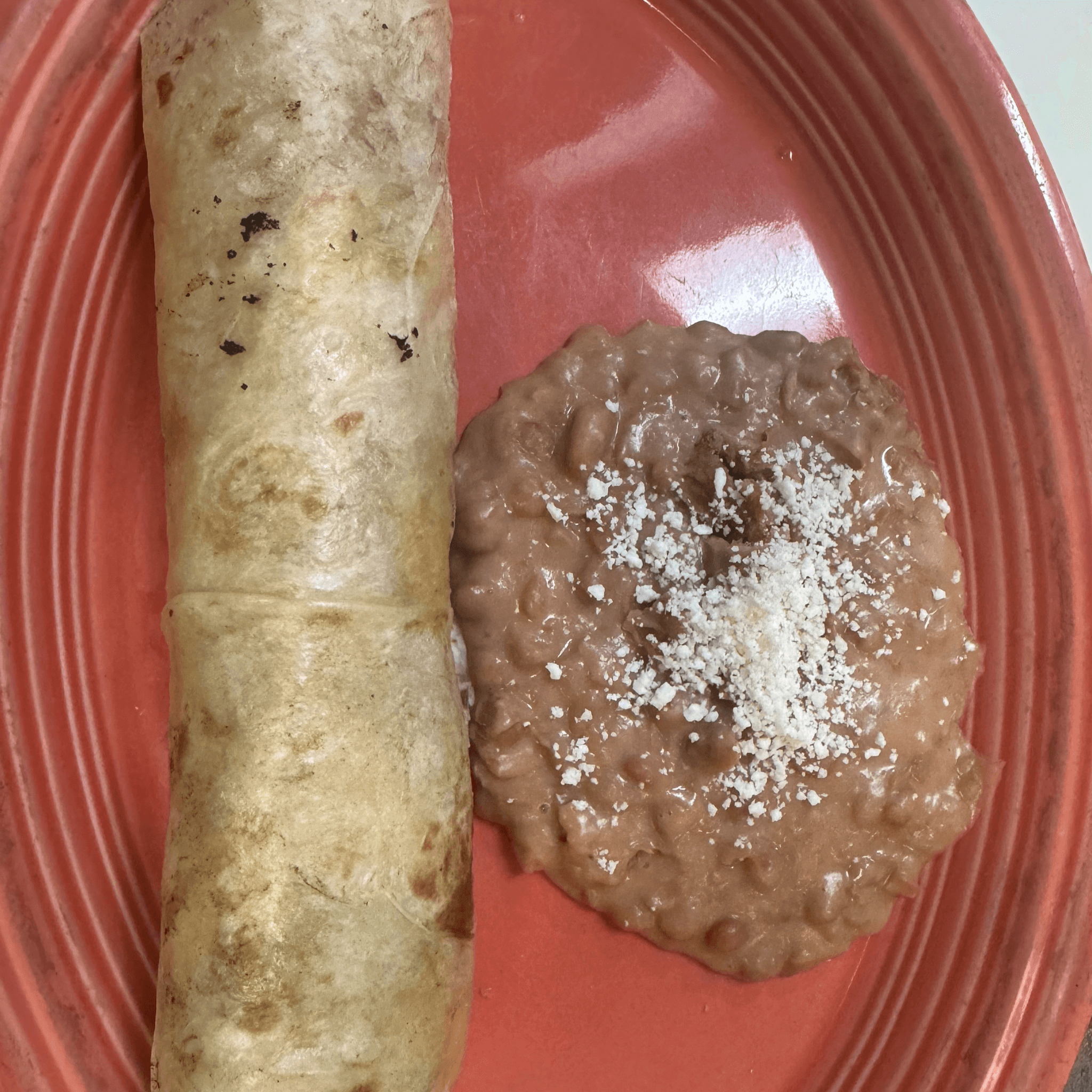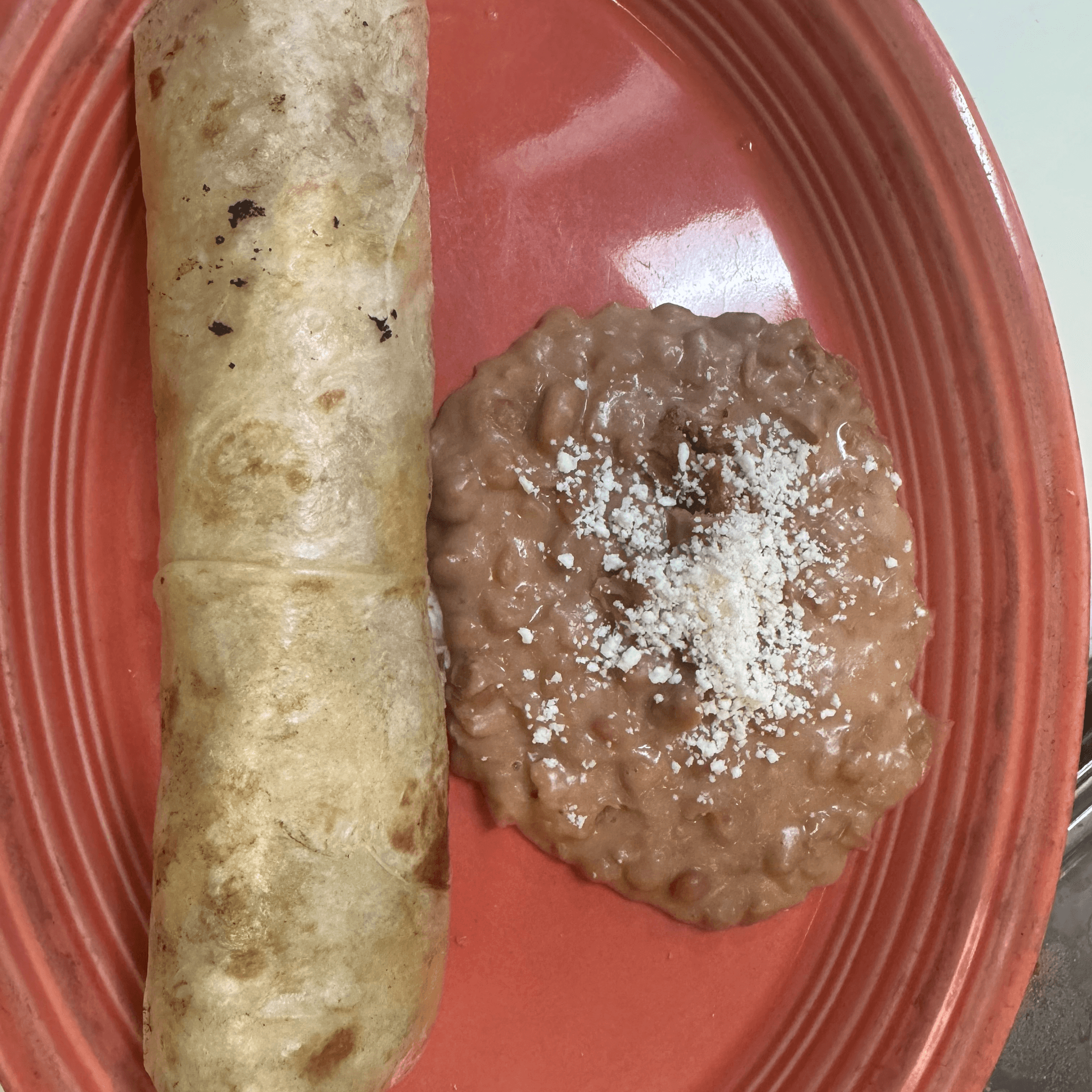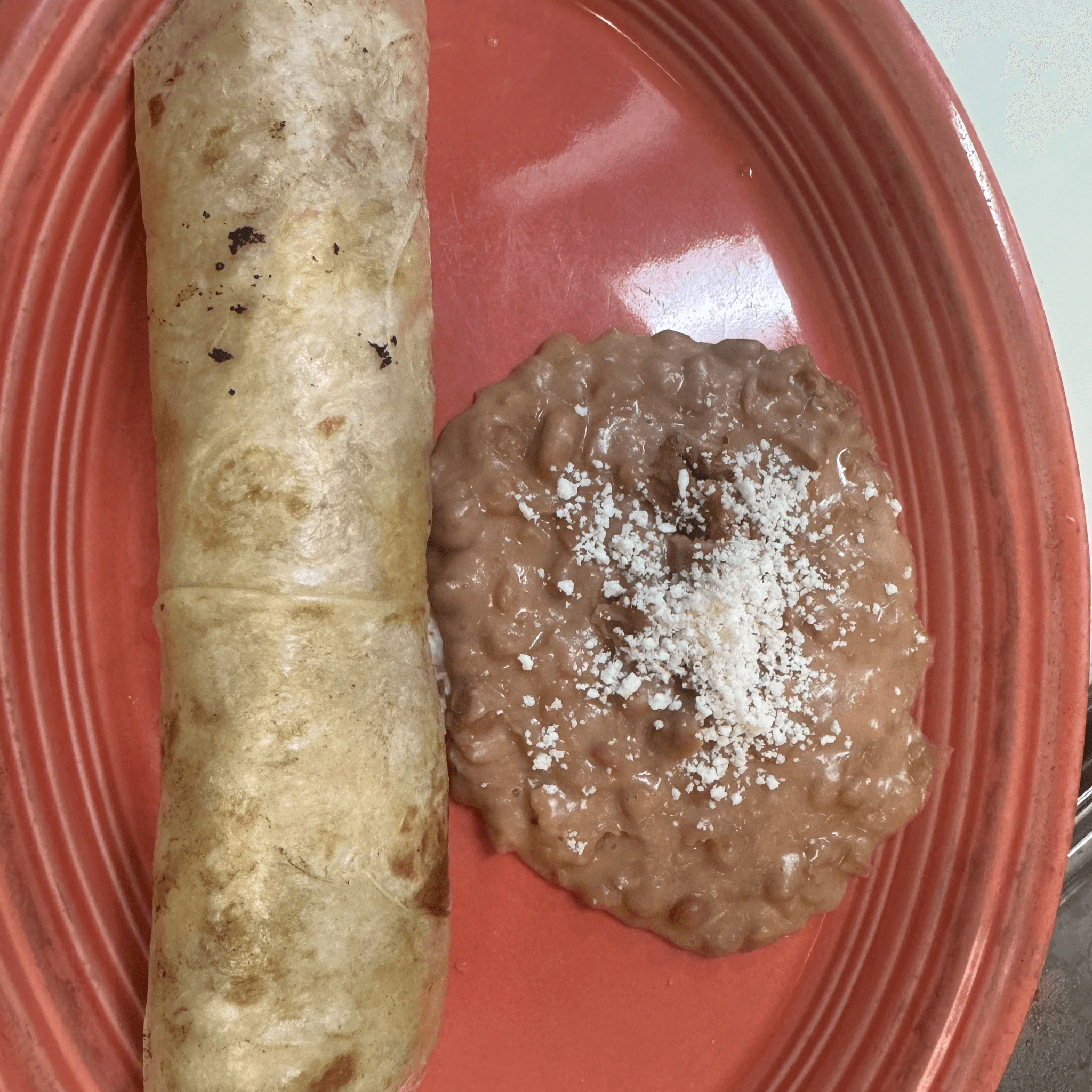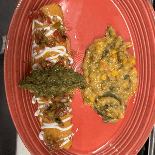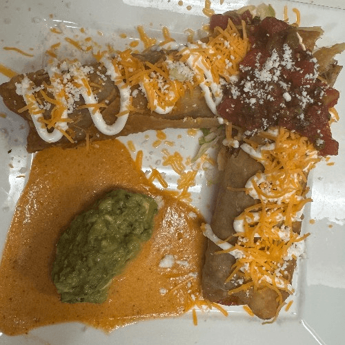 Your choice of Chicken or Carnita rolled in a flour tortilla, quick fried, topped with salsa cream, sour cream, guacamole and salsa fresca, with a choice of one side
