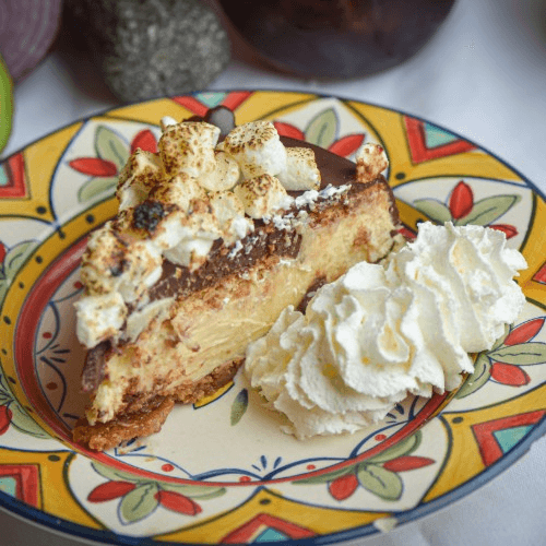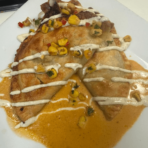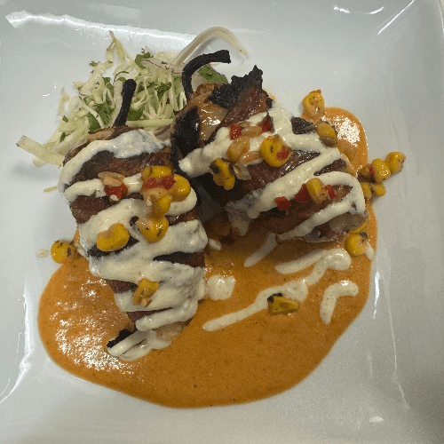 Stuffed with cilantro-basil pesto shrimp, sweet corn, green Chile, and manchego cheese, atop chipotle cream sauce, garnished with cabbage slaw, corn salsa, and anaheim crema