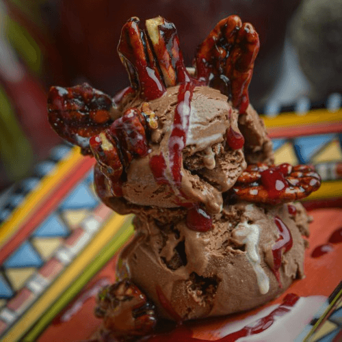 Rich dark chocolate jalapeño ice cream, drizzled with raspberry coulis, and sauce anglaise garnished with candied pecans, Ooh Yummie