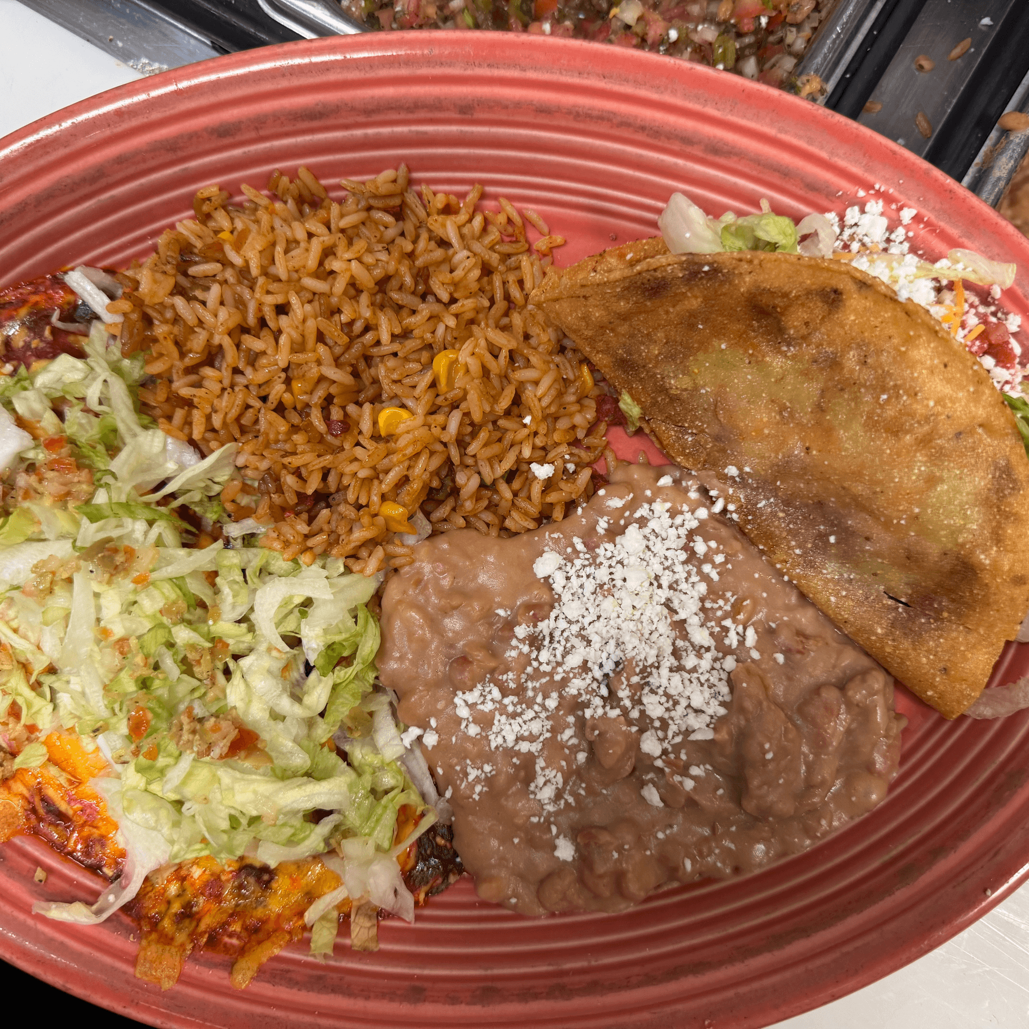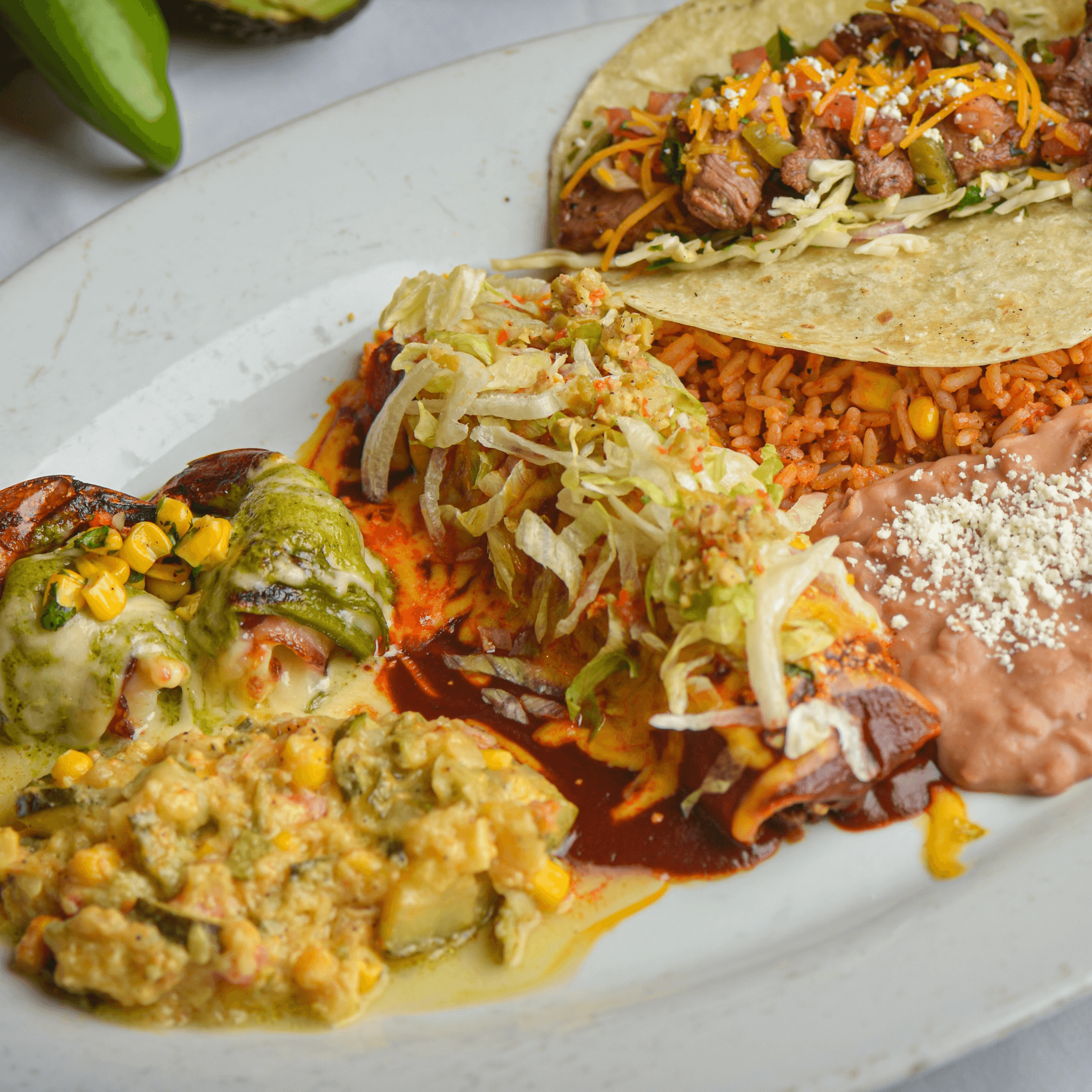 Two ground beef and two rolled chicken tacos. Served with rice, beans, and calabacitas