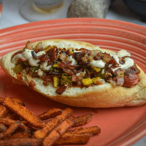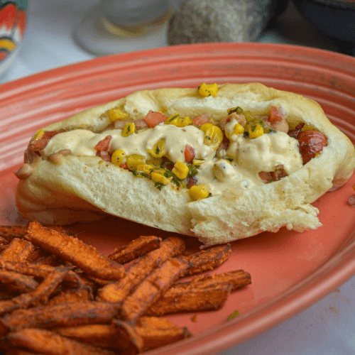 All beef hot dog topped with chorizo black beans, corn salsa, salsa fresca, smoked poblano crema, and chopped maple bacon