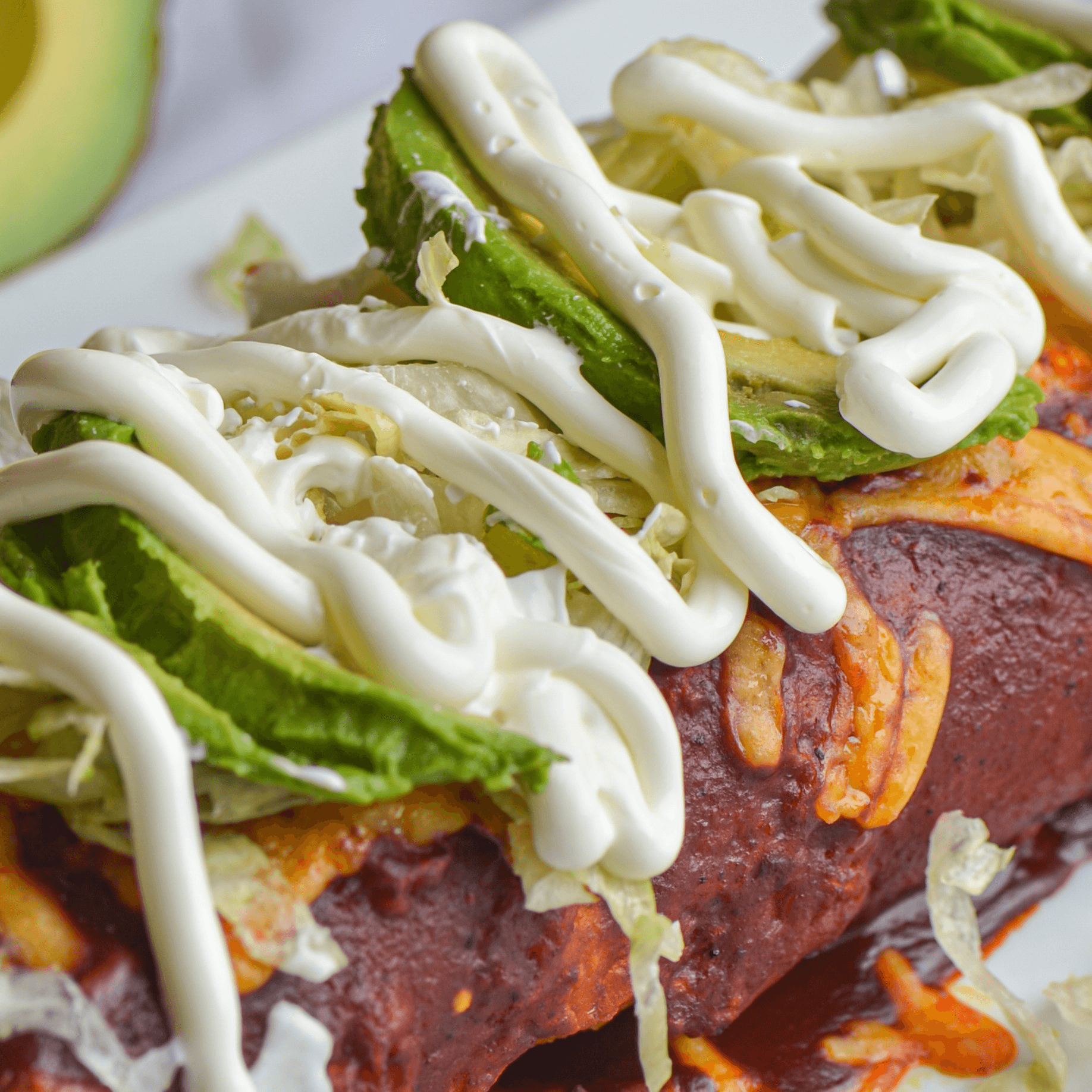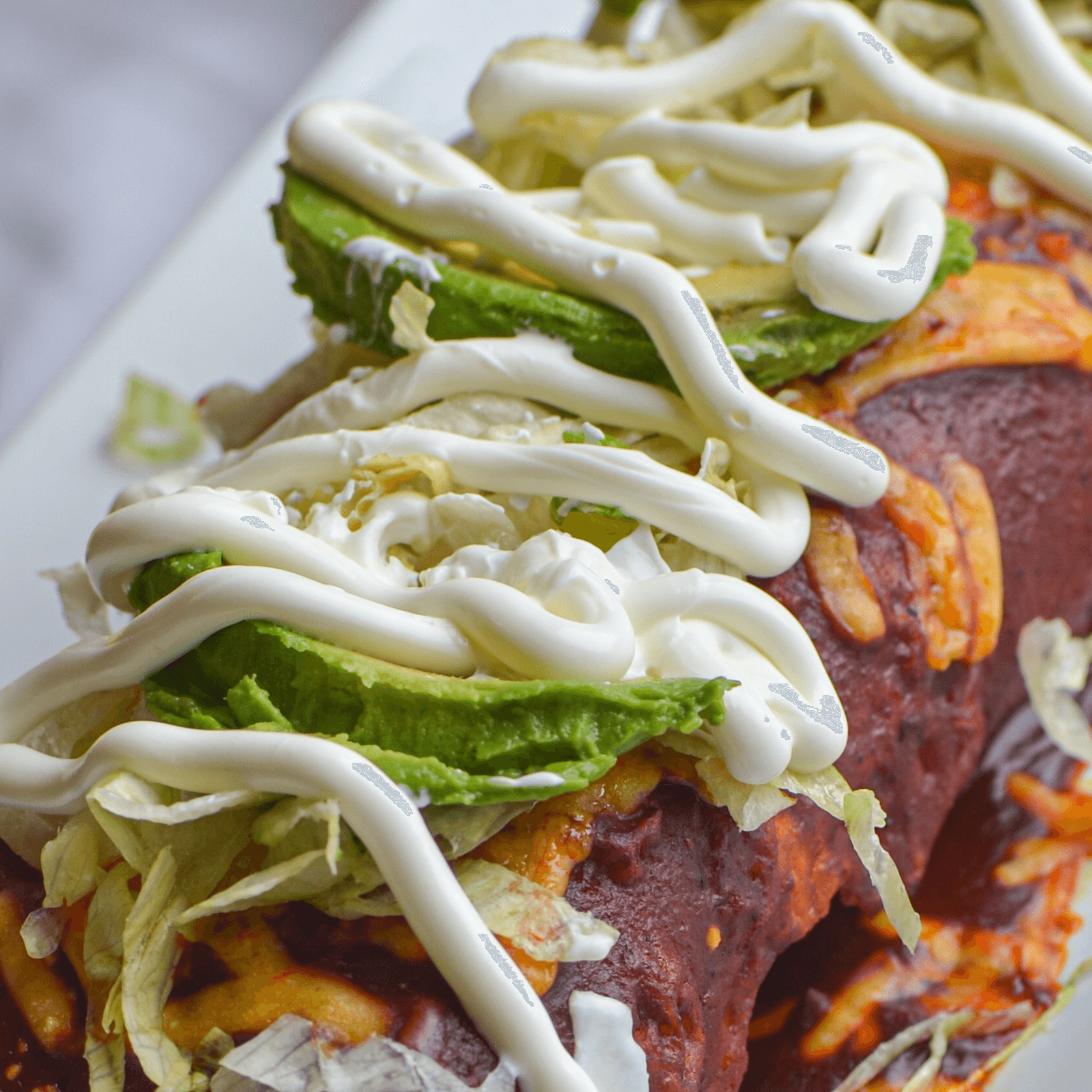 Chimis and burros served enchilada-style with lettuce, sour cream, and avocado. The chico size does not include avocado.