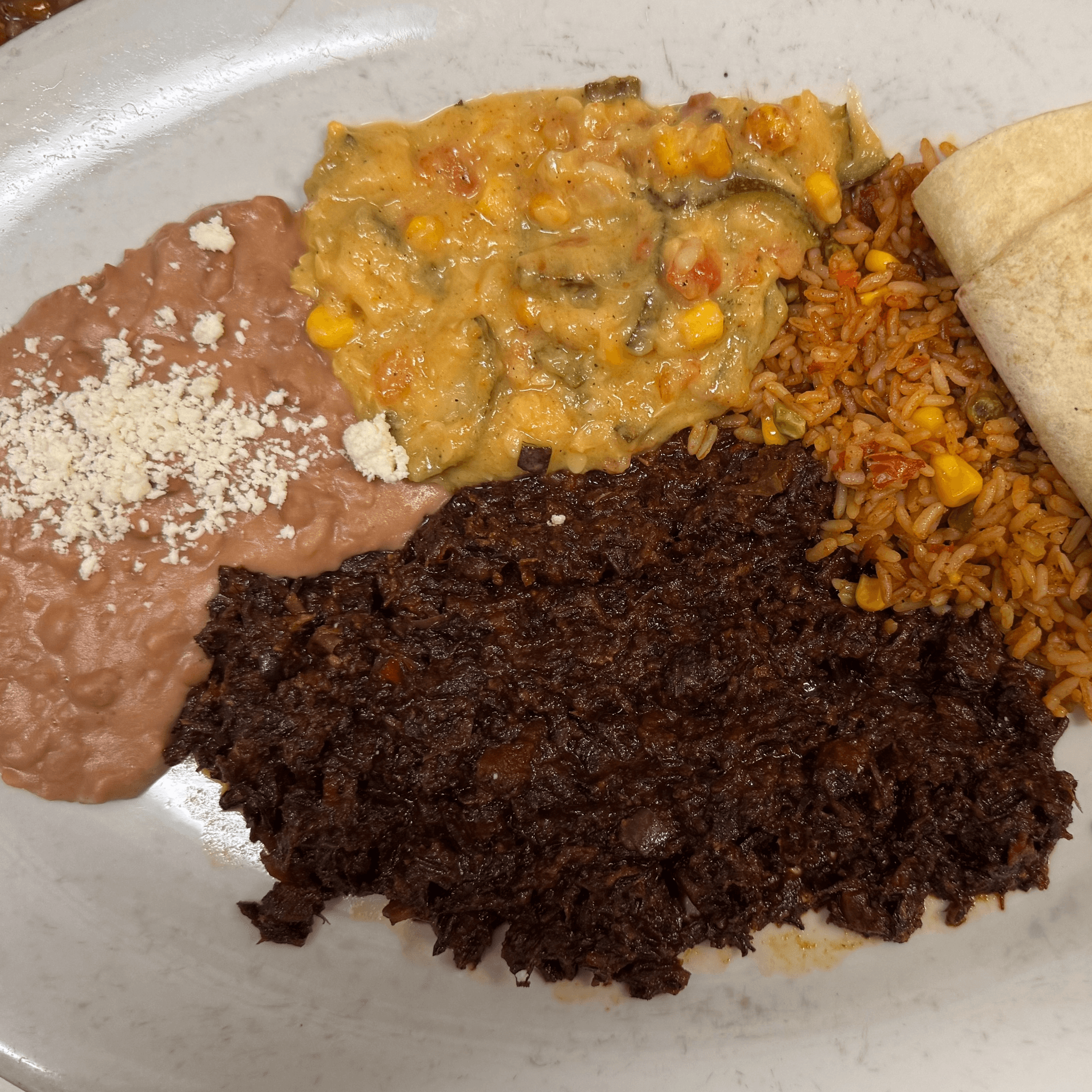 House dried seasoned beef, slow-simmered with tomato, green chile, peppers, onion, and garlic, served with rice, beans, calabacitas, and a warm hand-stretched flour tortilla