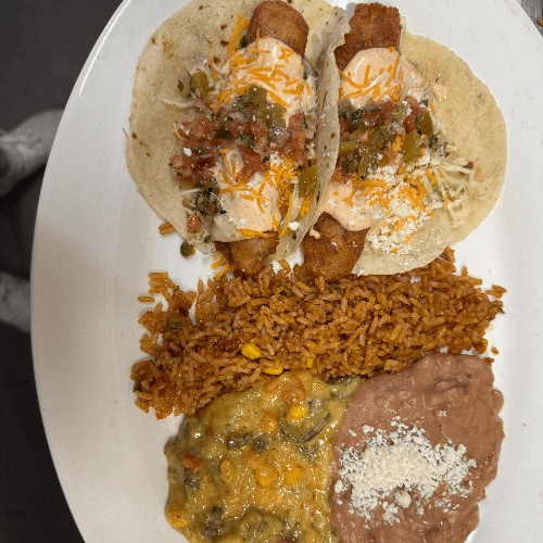 Two fried beer battered fish fillets, served on flour tortillas with cabbage slaw, cheese, baja sauce and salsa fresca, with rice, beans & calabacitas.
