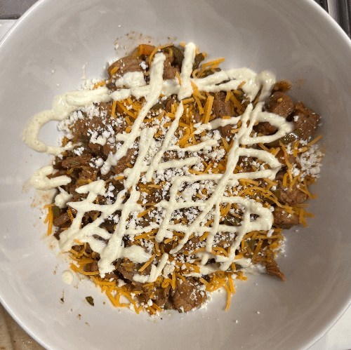 Hearty bowl of Spanish rice and vegetables with your choice of carnitas, carne asada, or chipotle chicken, topped with cheese and anaheim crema, served with a warm hand-stretched flour tortilla.