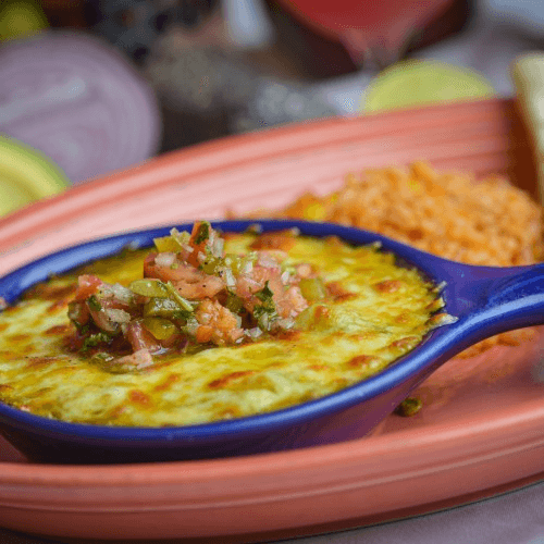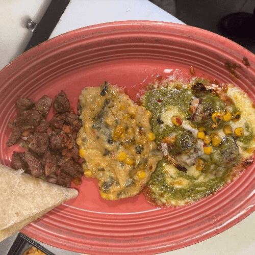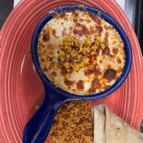 Shrimp sautéed with white wine, garlic, bacon, corn, and red pepper, tossed with chile con queso, topped with jack cheese, browned under the broiler, garnished with salsa fresca, and served with rice and a warm hand-stretched flour tortilla.