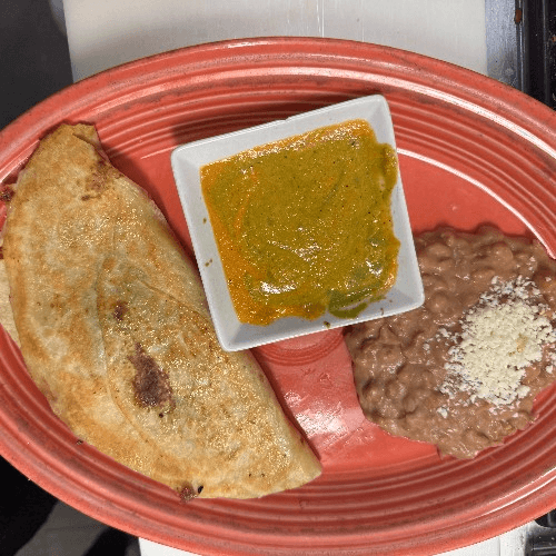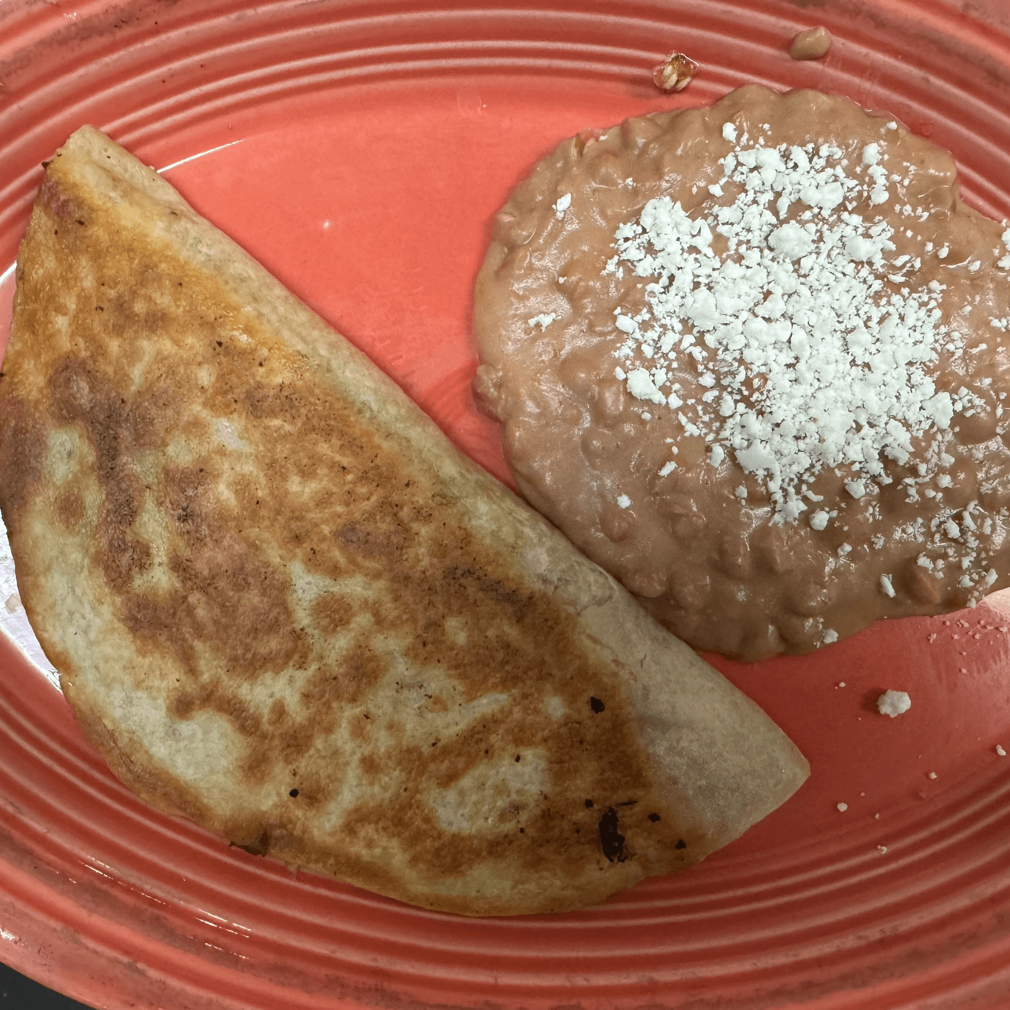 A large taco of carne asada, house beans, Jack cheese, garlic aioli, caramelized onions and peppers, grilled crisp on the flat top with a choice of one side
