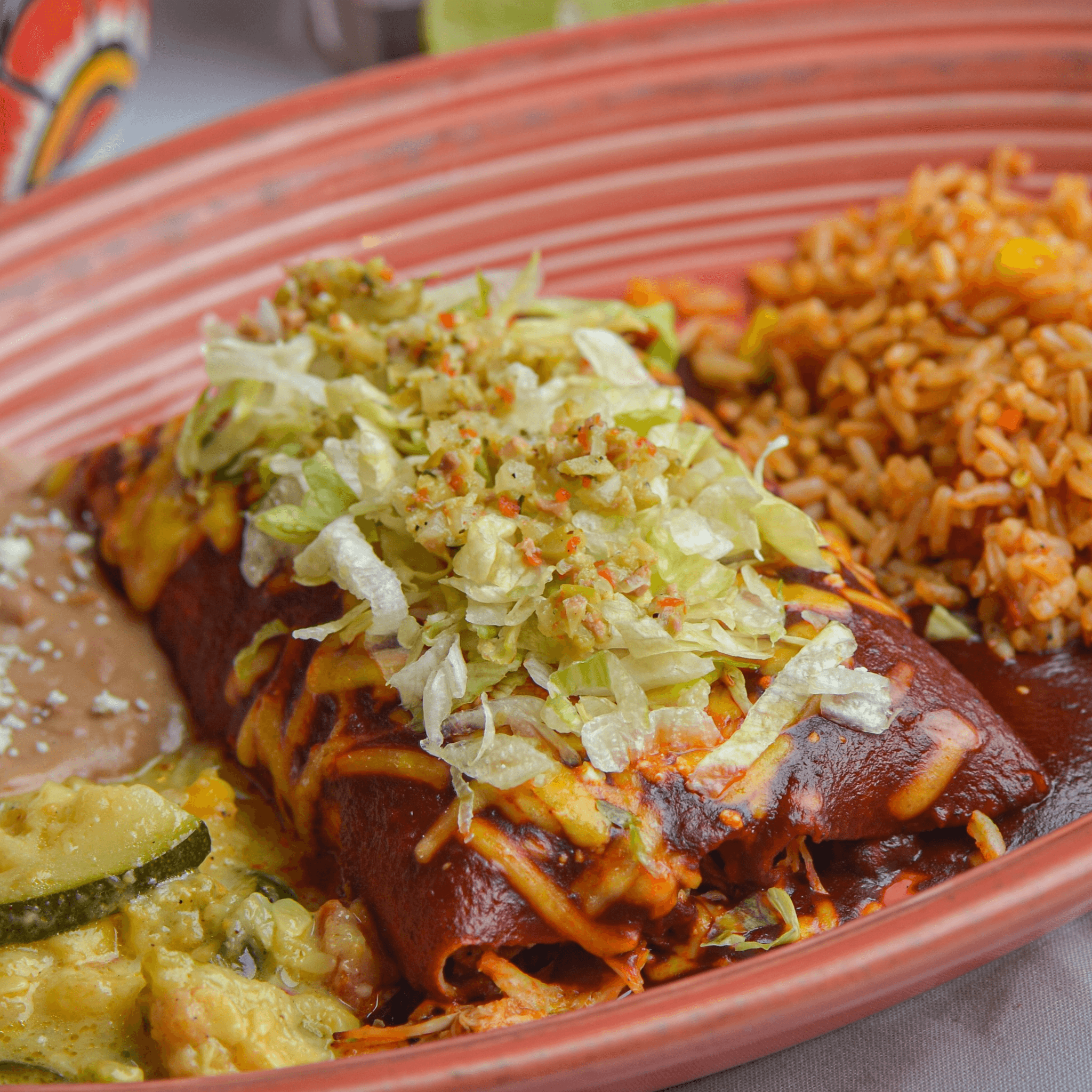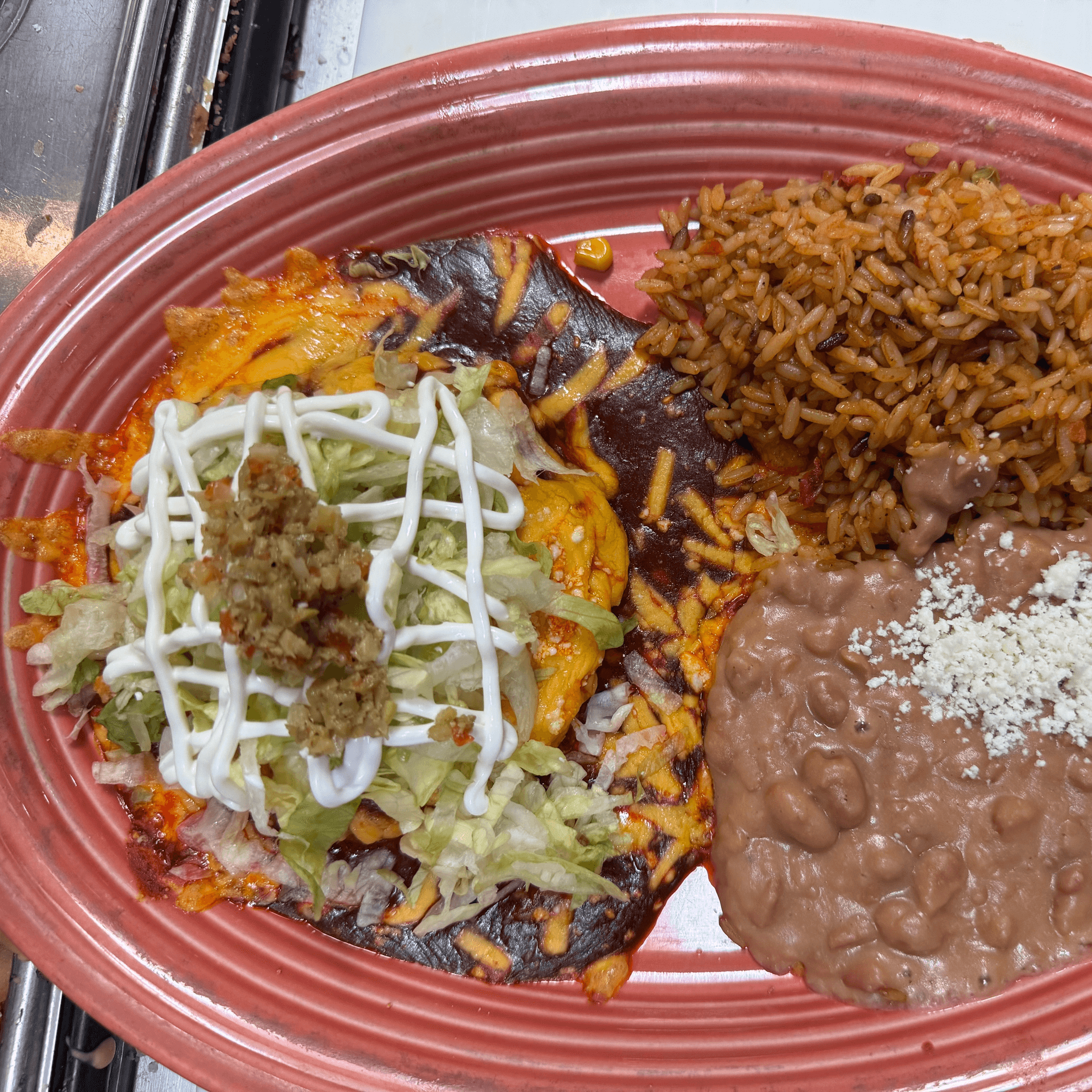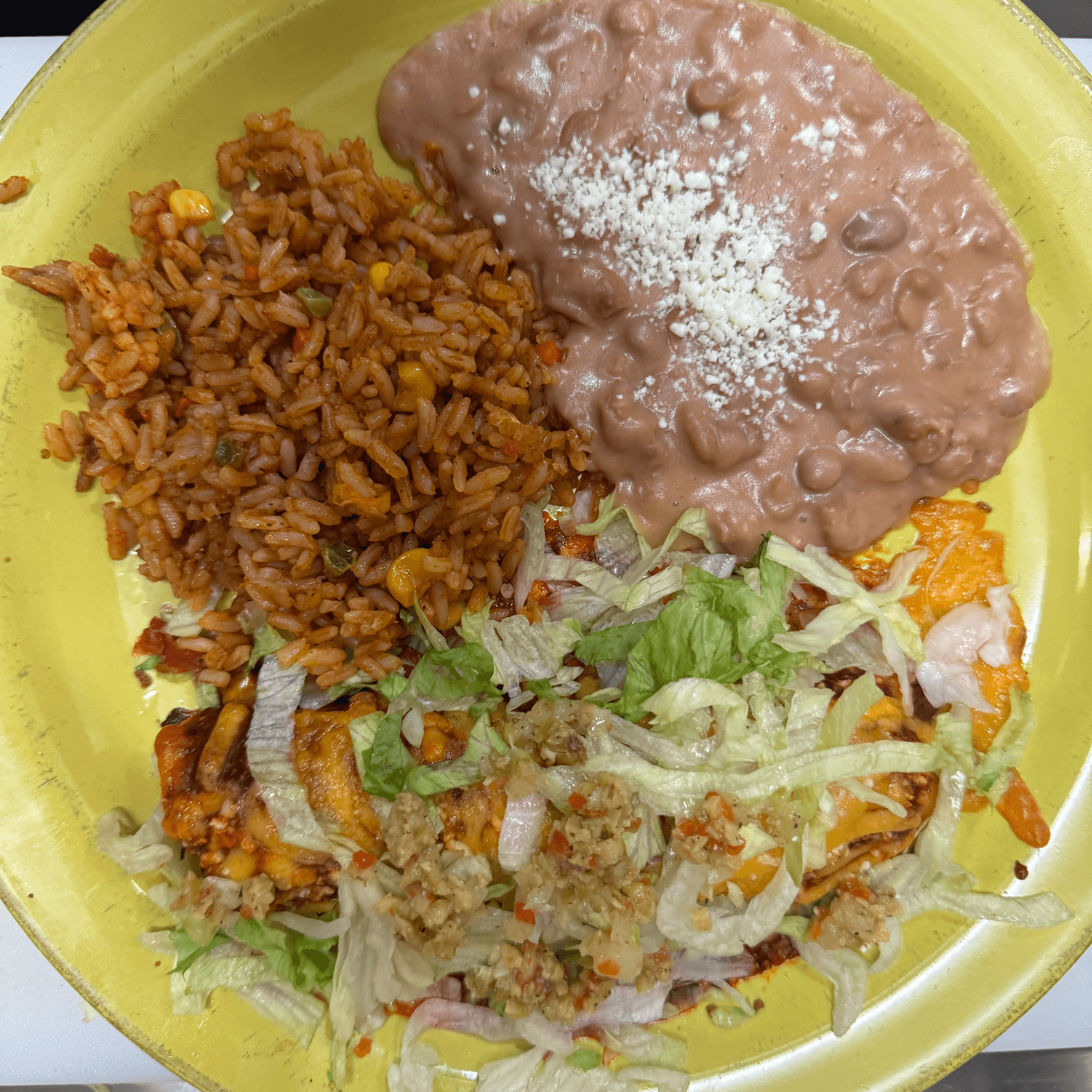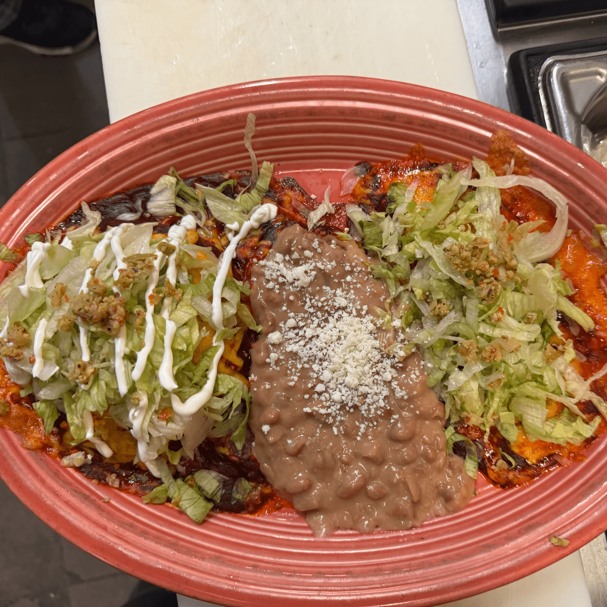 Mini corn tortillas layered with your choice of chicken, carnitas or ground beef, enchilada sauce and melted cheese, garnished with lettuce, sour cream and olive mix, with a choice of two sides