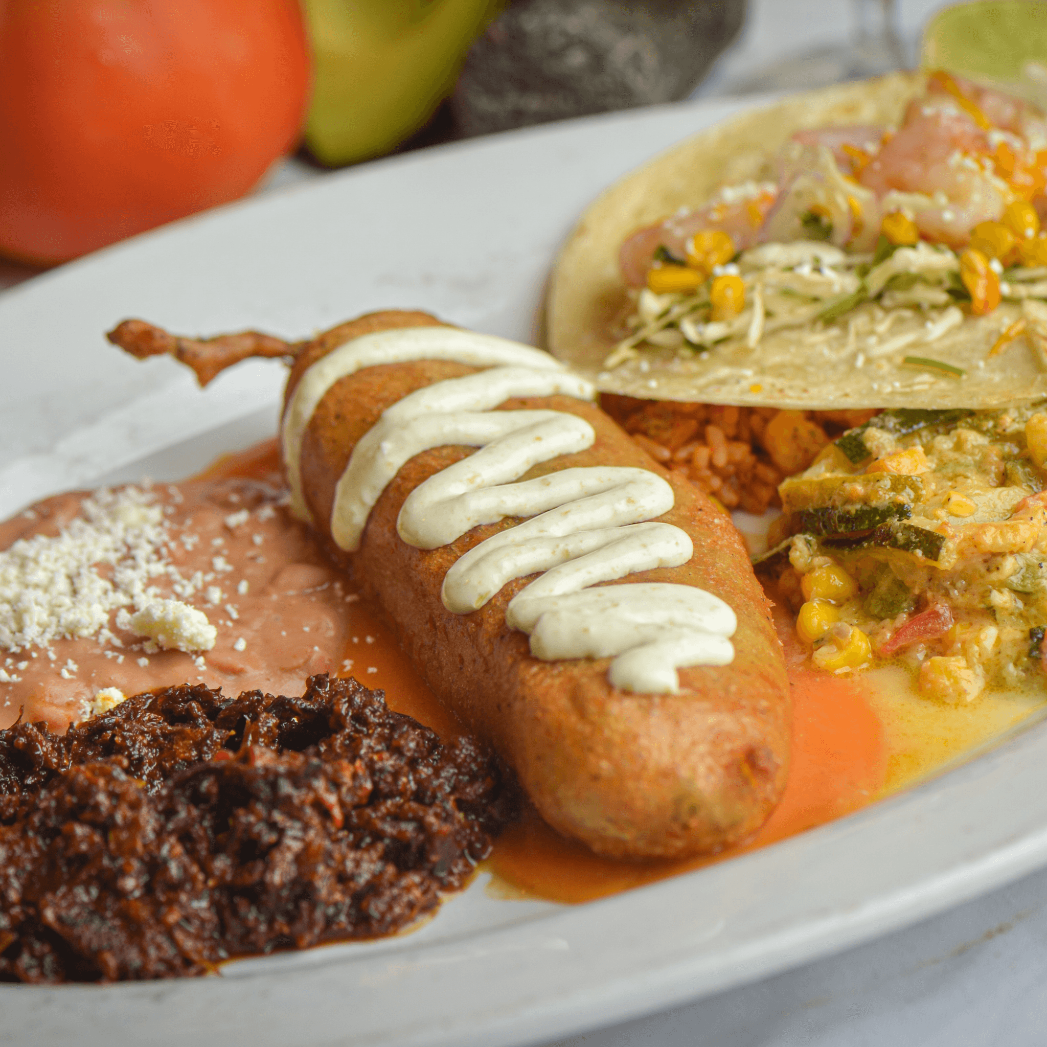 A beer battered, roasted anaheim chile, stuffed with jack and manchego cheese, quick fried, atop smokey tomato coulis garnished with anaheim crema. Served with rice, beans, and calabacitas