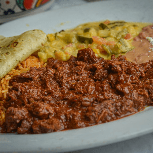 Tender morsels of beef in a red chile sauce, served with rice, beans, calabacitas, and a warm hand-stretched flour tortilla