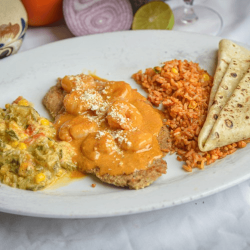 Tender pork pounded thin, breaded, topped with garlic shrimp, and chipotle cream sauce, served with rice, calabacitas, and a warm hand-stretched flour tortilla