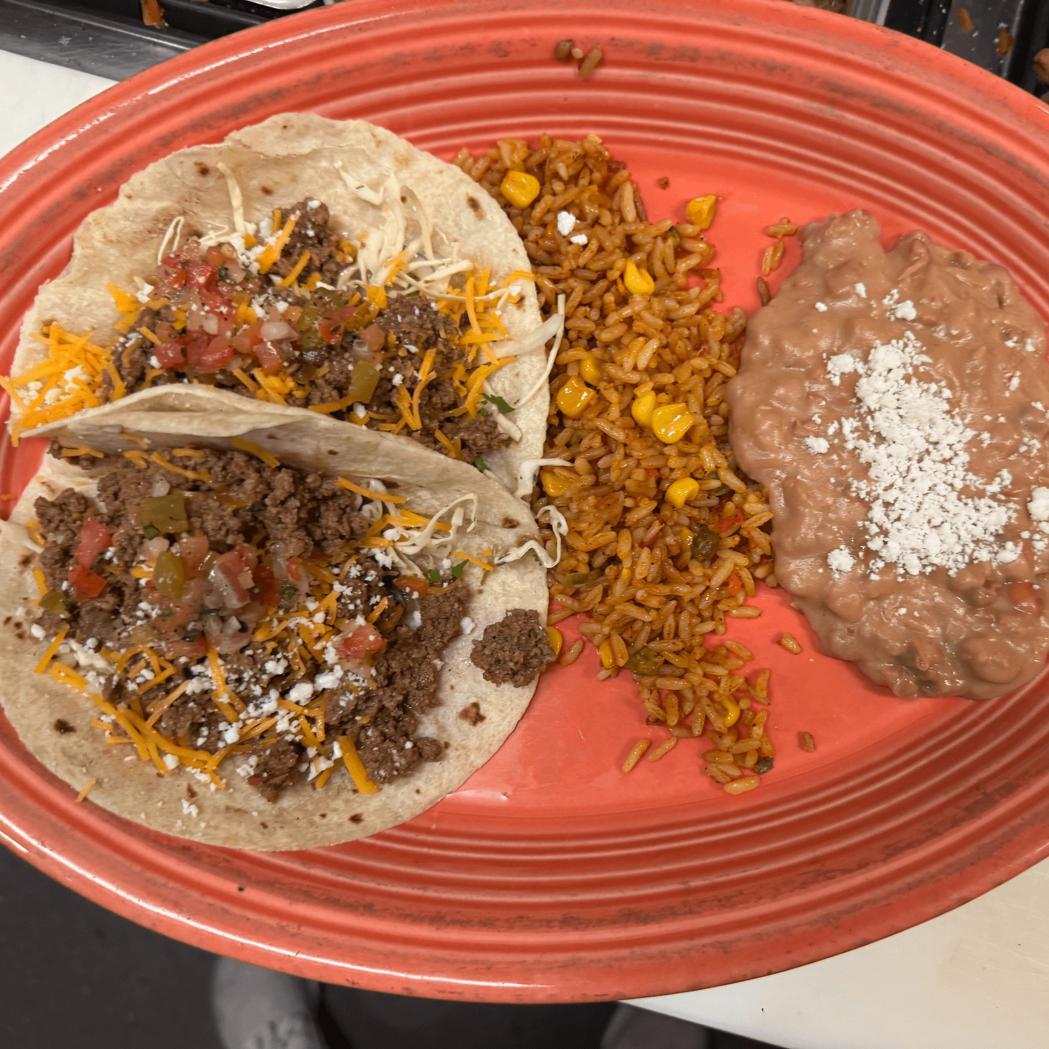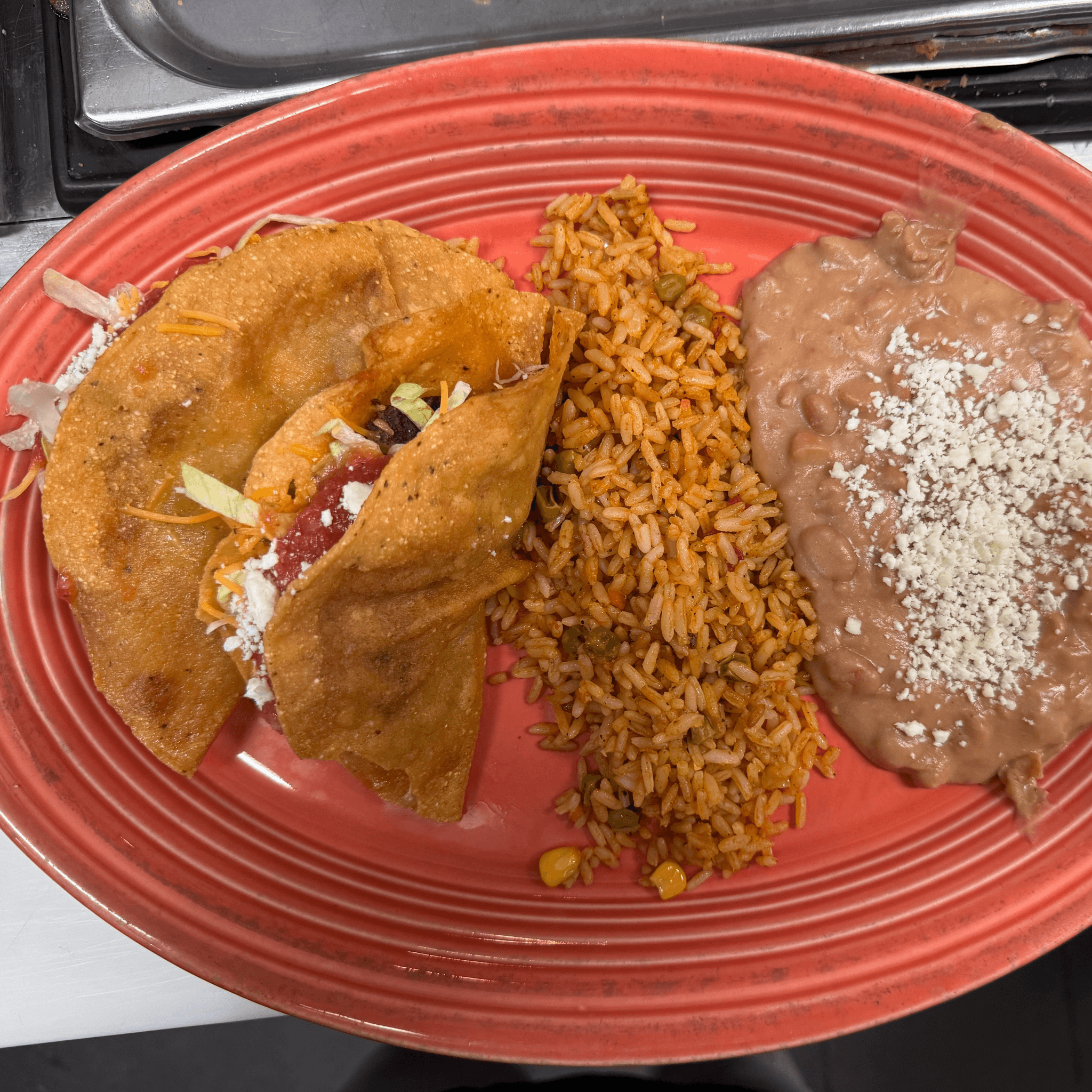 Three ground beef tacos made the old-fashion way or rolled chicken tacos with taco sauce, shredded lettuce, and cheese, with rice, beans and calabacitas