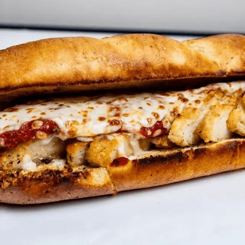 Parmesan crusted all white chicken breast, baked and sliced, topped with marinara, parmesan, and mozzarella, on a lightly toasted roll