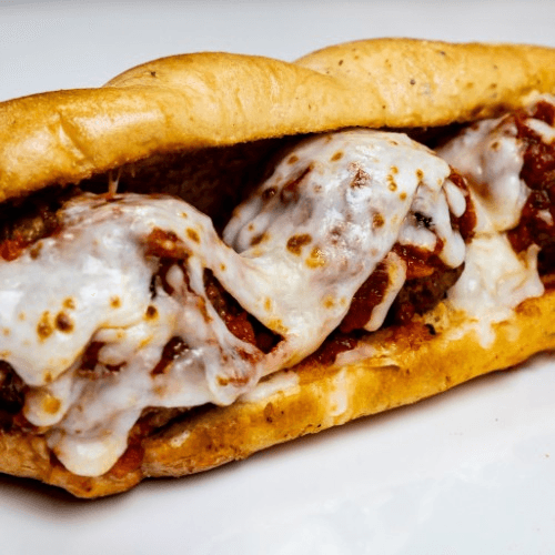 A brioche bun with garlic butter and melted mozzarella, whole large meatball topped with marinara and more melted mozzarella cheese.