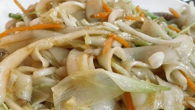 Stir fried pork strips in house sauce with green onions and tofu sheets.