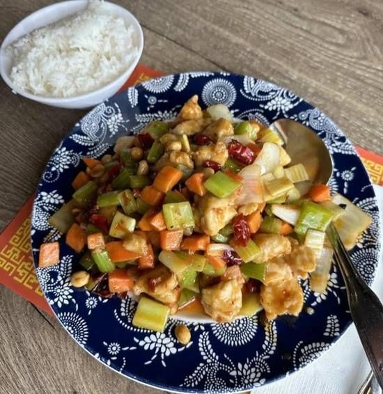 Spicy diced chicken with bell peppers, carrots, celery, and dried chili peppers.