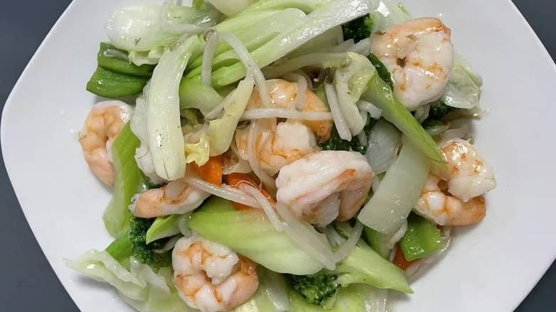 Shrimp with broccoli, carrots, and bok choy, mixed with onions and other vegs.