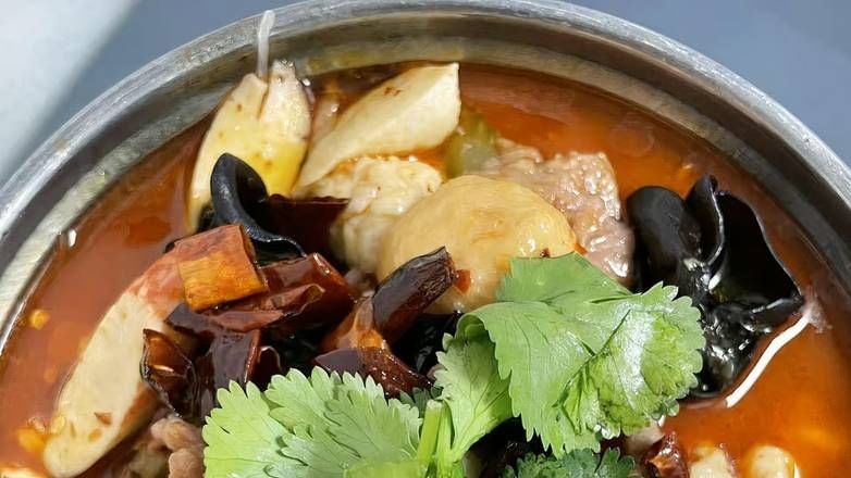 A flavorful mix of chicken, beef, shrimp, luncheon meat, tripe, paired with broccoli, cauliflower, bean curd skin, tofu sticks, lotus root, potatoes, and more—all in one spicy and savory dish! 鸡、牛、虾、午餐肉、毛肚等荤素搭配,配西兰花、花菜、豆皮、腐竹、藕片、土豆等,多种食材麻辣鲜香,一锅满足!.