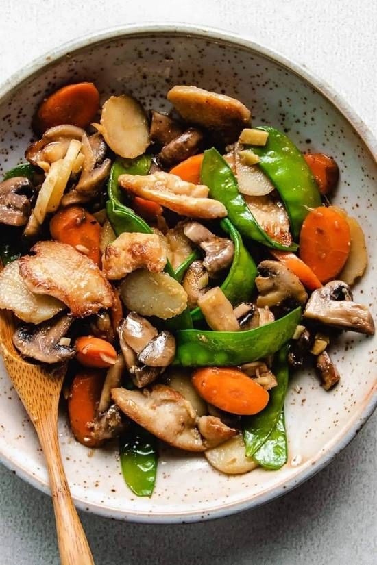 Tender chicken slices with mushrooms, snow peas, and water chestnuts, cooked in a light sauce.