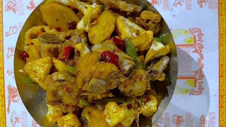Spicy chicken, cauliflower, lotus root, celery, potato. Wood ear mushroom, broccoli and onions mixed with chili peppers.