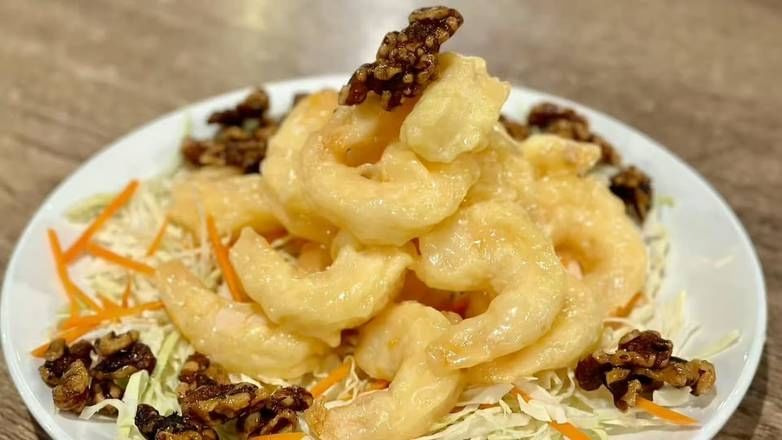 Shrimp glazed with honey and walnuts, offering a delightful balance of sweet and savory flavors.