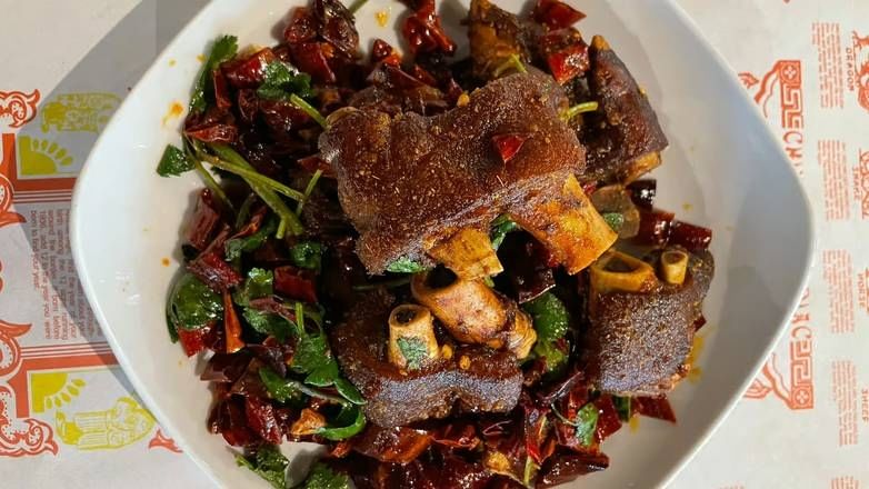 Spicy pig feet with dry chili, offering a bold and fiery flavor for adventurous palates.