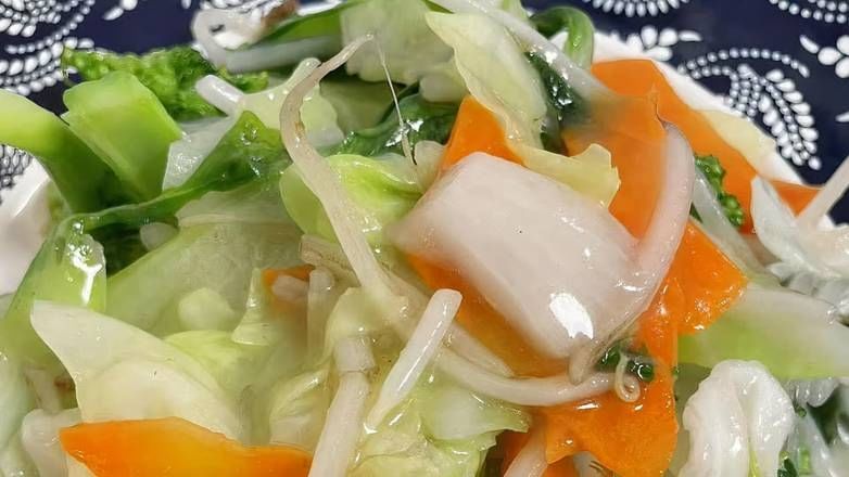 A mix of cabbage, bok choy, carrots, onions, broccoli and bean sprouts.