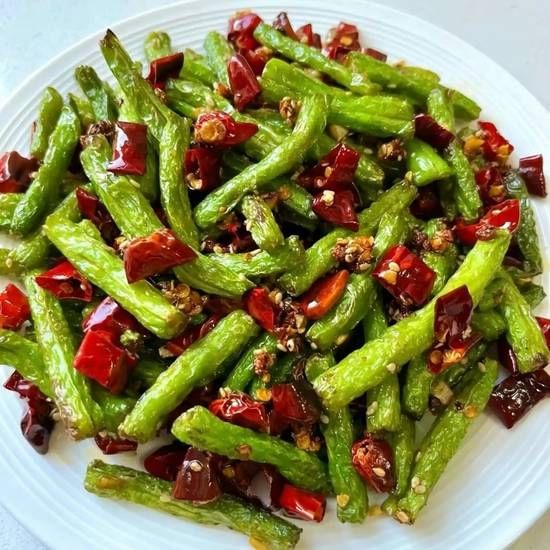 Spicy sautéed string beans, expertly fried for a crisp texture and bold flavor.