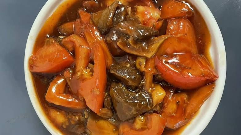 Tender beef simmered with tomatoes for a hearty stew, perfect for a comforting lunch.