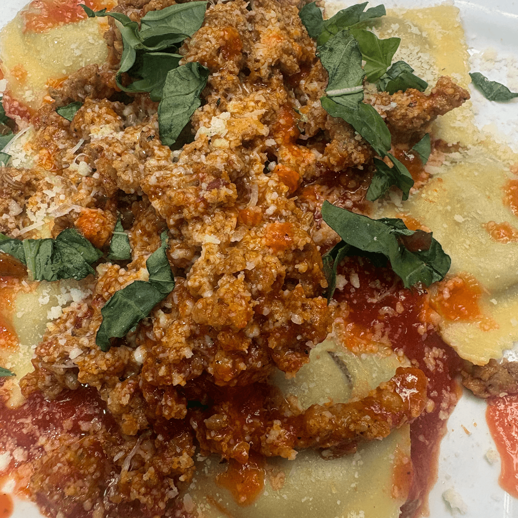 Layered Italian sausage, ground beef, ricotta, mozzarella, marinara, and parmesan, huge & delicious, served with side salad