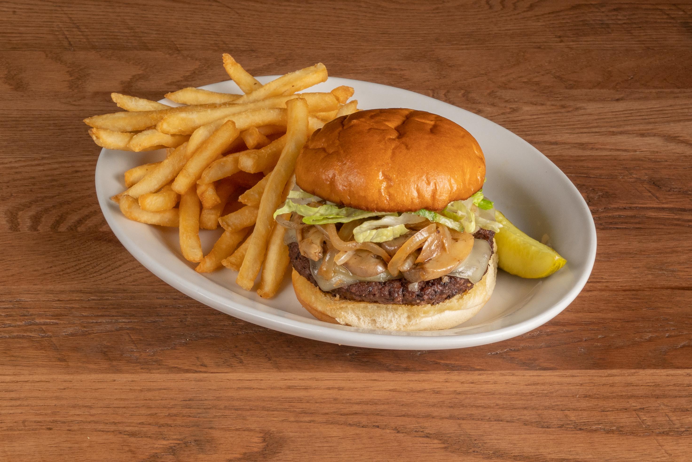 Our fresh Angus beef patty topped with Swiss cheese, sauteed mushrooms, lettuce, tomato and onion on a brioche roll.