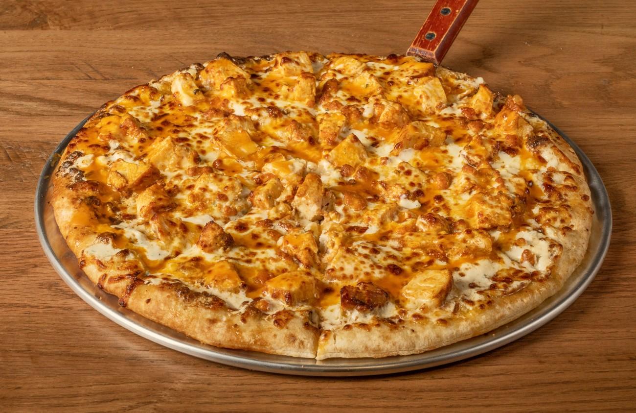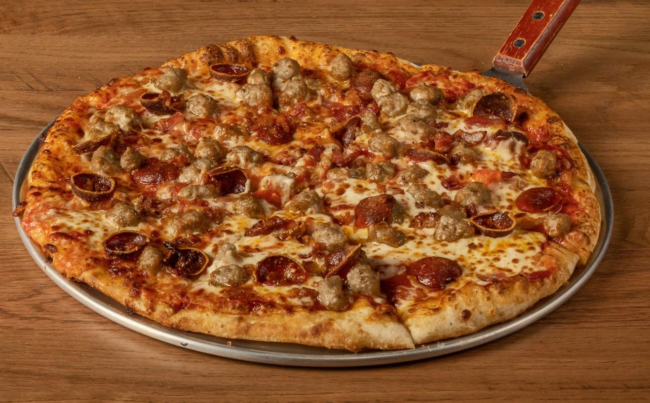 Anchor Bar homemade pizza sauce and mozzarella cheese, topped with cup & char pepperoni, bacon and sausage.