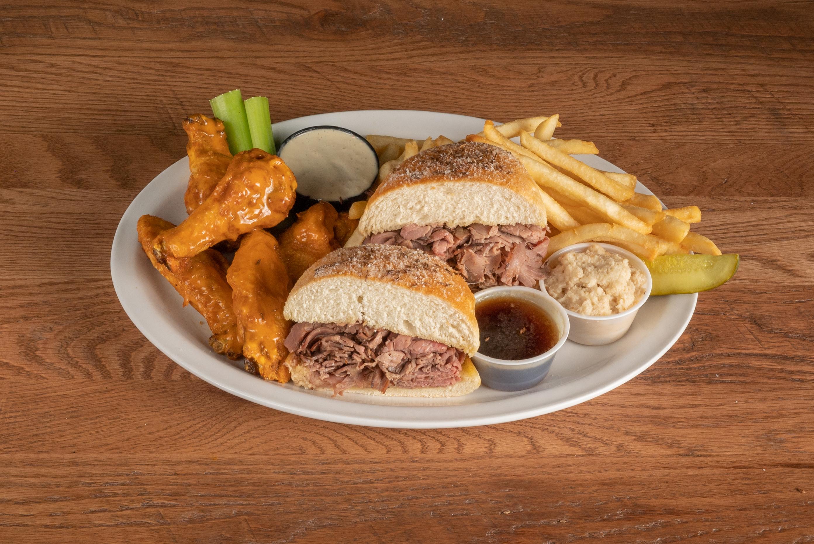 Five traditional wings tossed in your choice of Anchor Bar Wing Sauce or Dry Rub alongside Buffalo’s favorite sandwich! Juicy roast beef piled high on a freshly baked kimmelweck roll. Served with au jus, horseradish, and bleu cheese dressing.