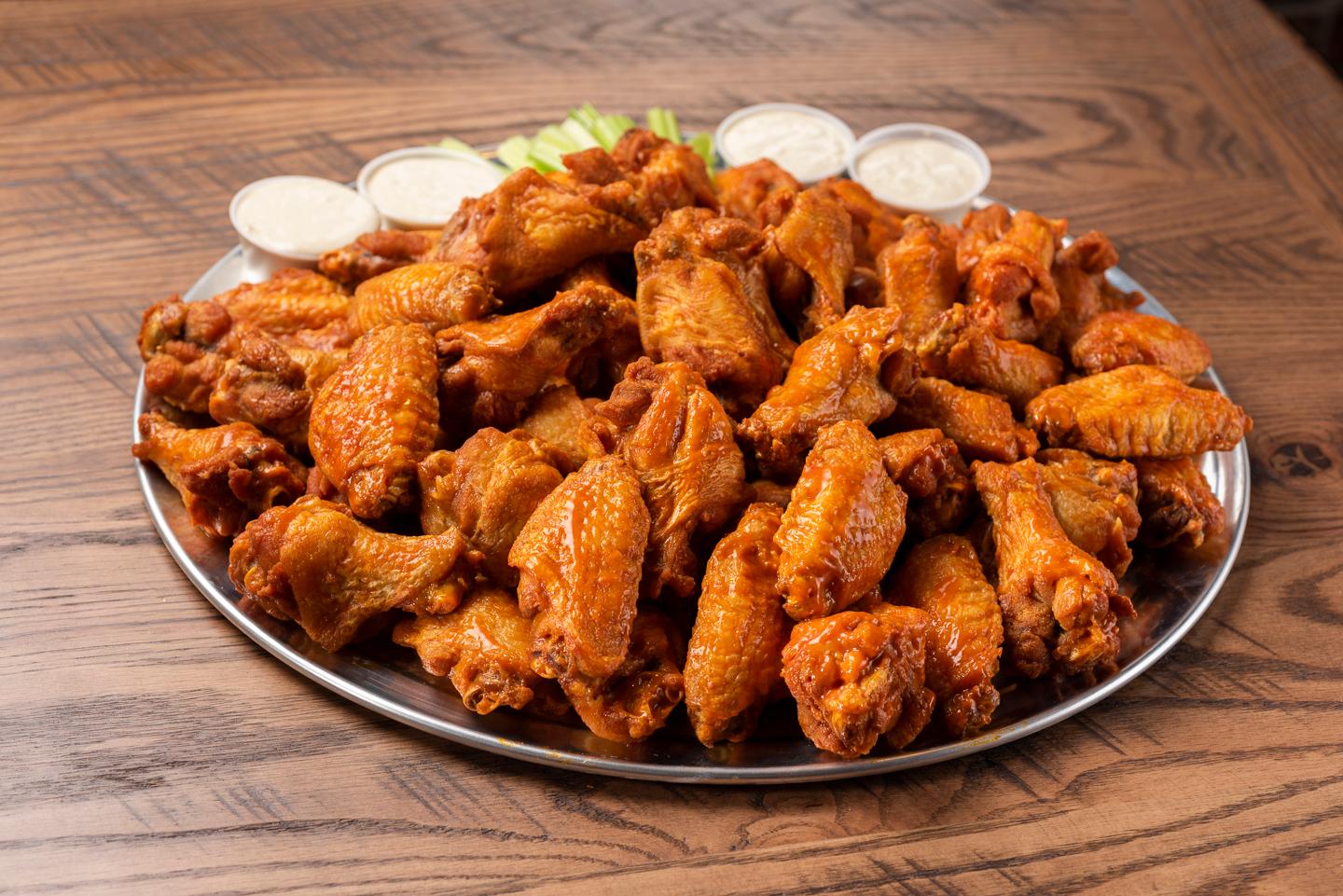 50 of our World-Famous wings tossed in your choice of sauce or rub. Served with bleu cheese and celery.