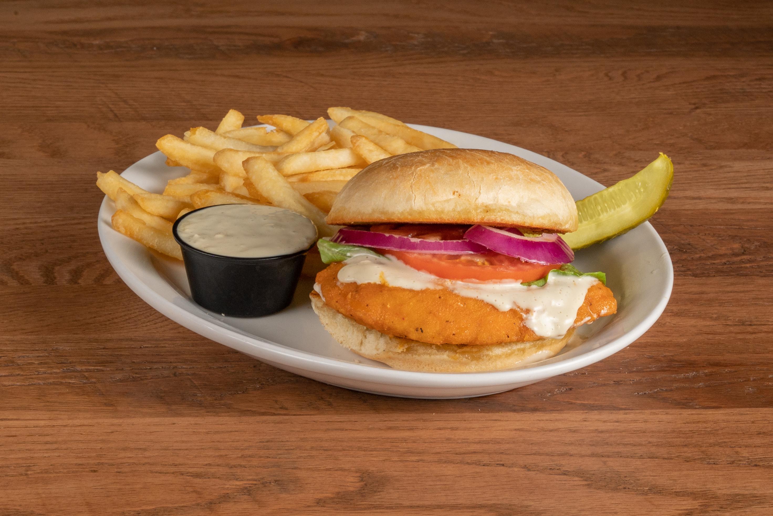 Breaded chicken breast tossed in Original (Medium) Anchor Bar Wing Sauce topped with lettuce, tomato and red onion. Served with Bleu cheese on a kaiser roll.