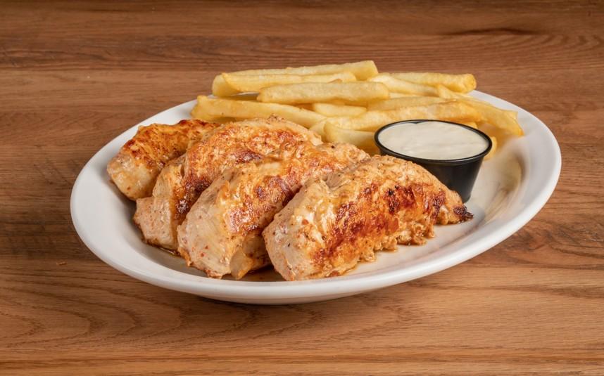 Gluten-free. Fresh chicken tenders grilled and coated in your choice of Anchor Bar rubs or sauces. Served with French fries and Bleu cheese.