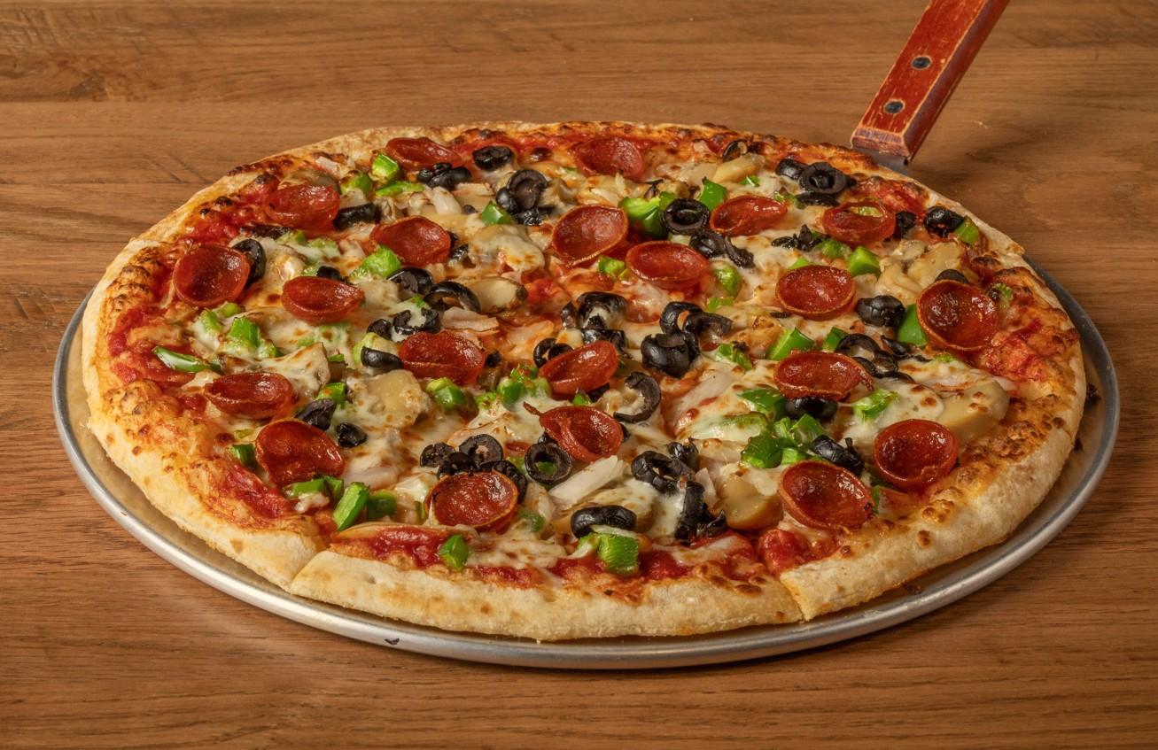 Sausage, green peppers, pepperoni, onions, mushrooms, mozzarella cheese and Anchor Bar homemade pizza sauce.