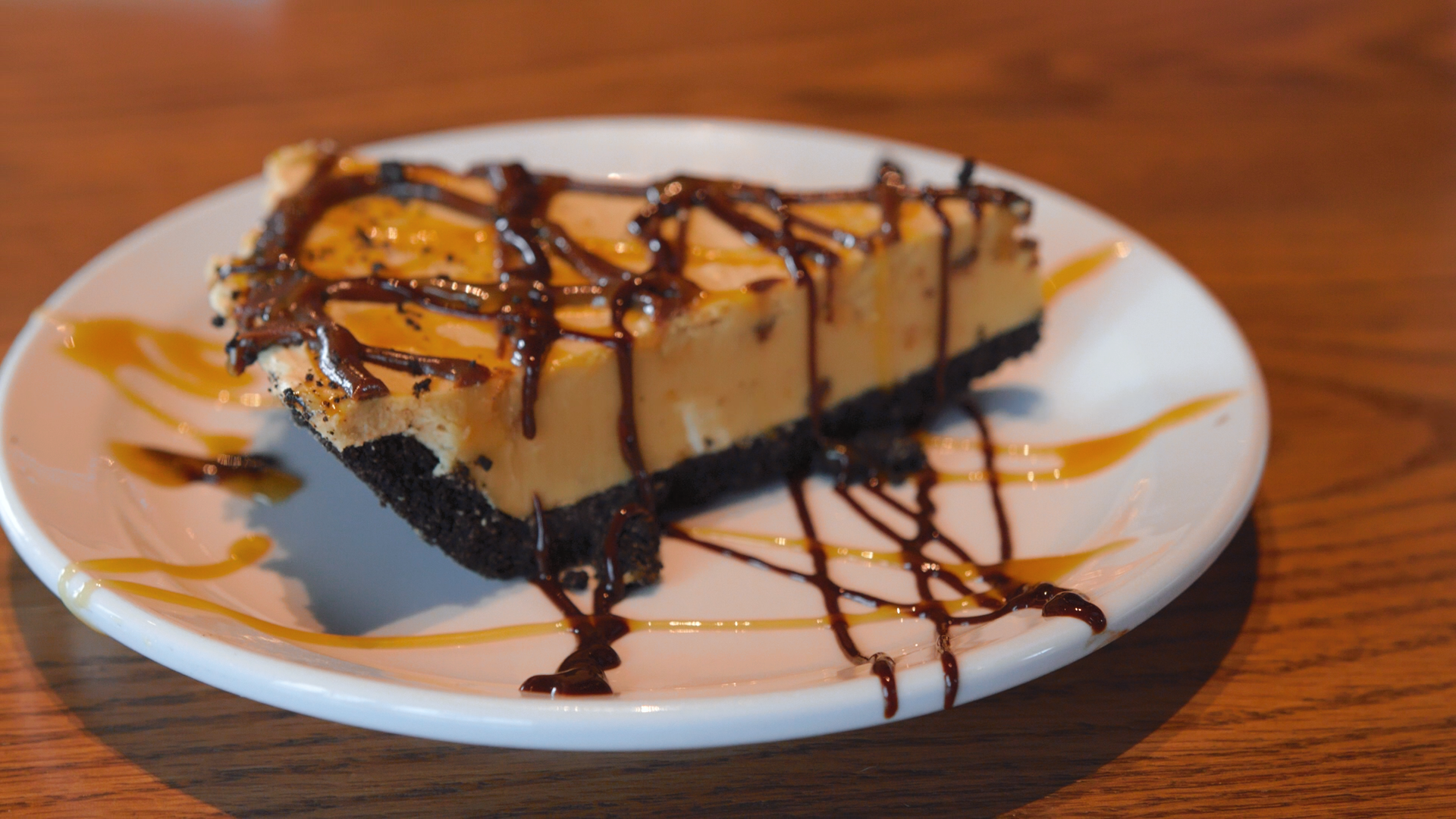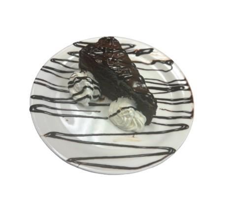 Layers of rich chocolate cake filled with 2 layers of Belgian chocolate mousse and topped with a chocolate ganache, chocolate syrup drizzle and whipped cream.
