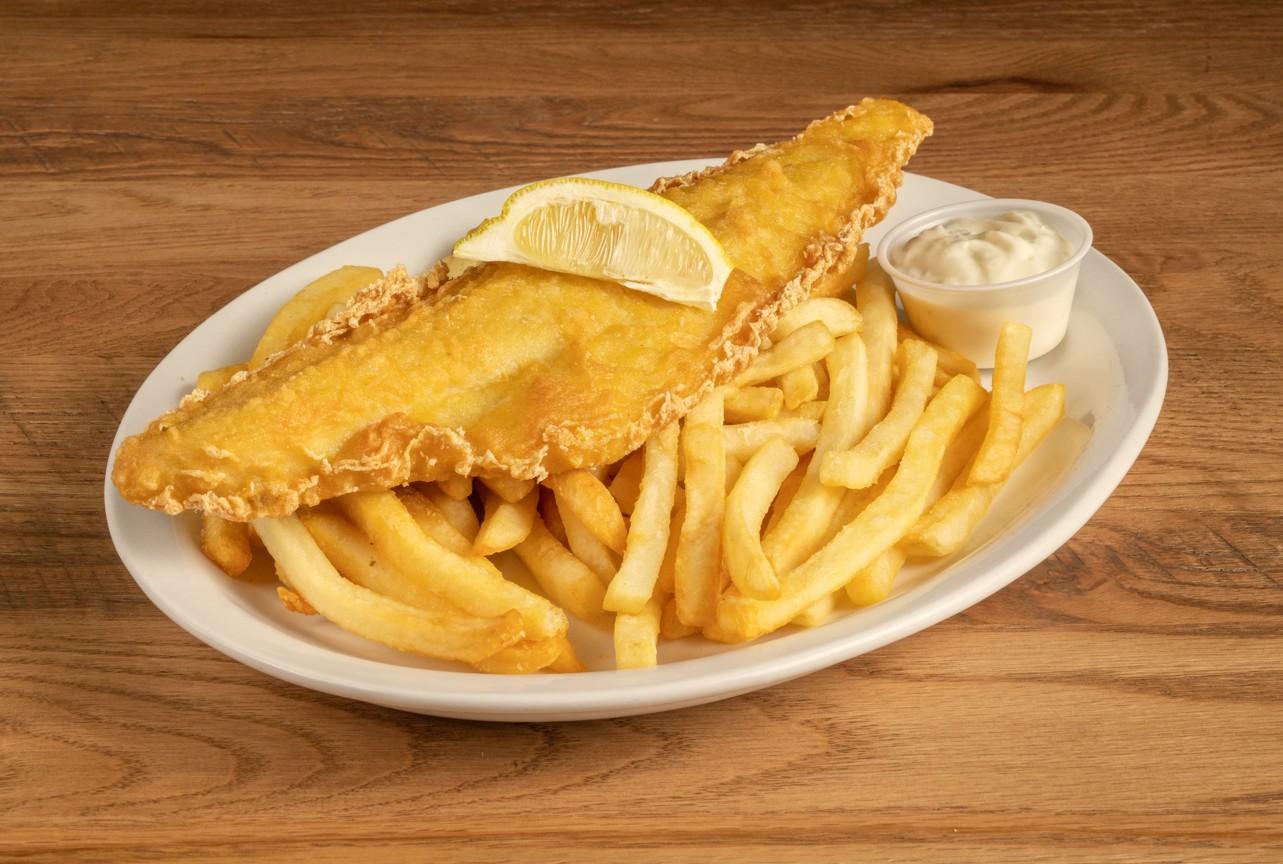 A generous portion of fresh haddock. Served with french fries and tartar sauce on the side.