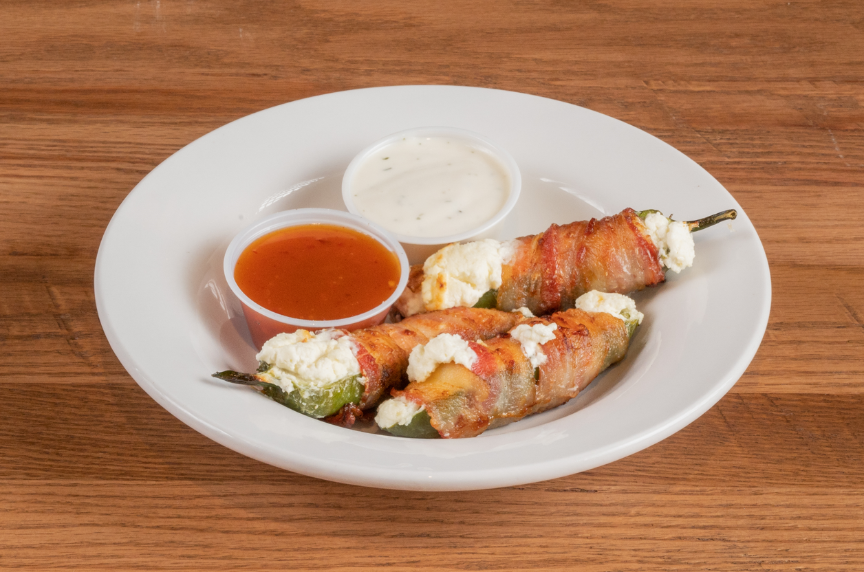 Jalapenos stuffed with cream cheese, wrapped in bacon, roasted to perfection. Served with ranch and honey garlic to dip.