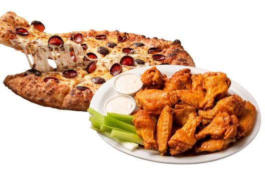Twenty traditional or boneless wings tossed in your favorite Anchor Bar Wing Sauce or dry rub served with a large signature "cup & char" pepperoni pizza.