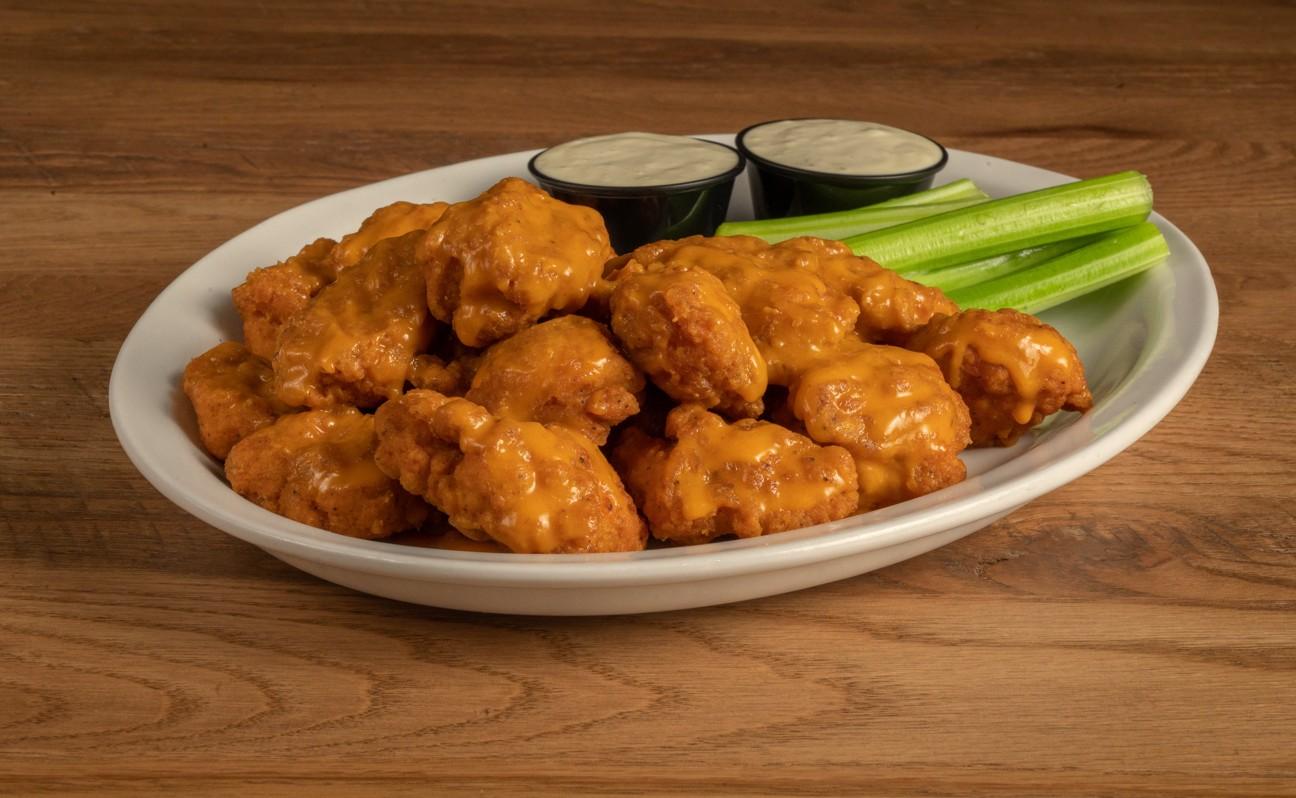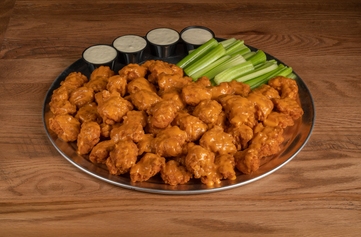 50 Fresh, white meat chicken breast chunks, breaded in house, deep fried to perfection, tossed with your choice of sauce. Served with bleu cheese and celery.
